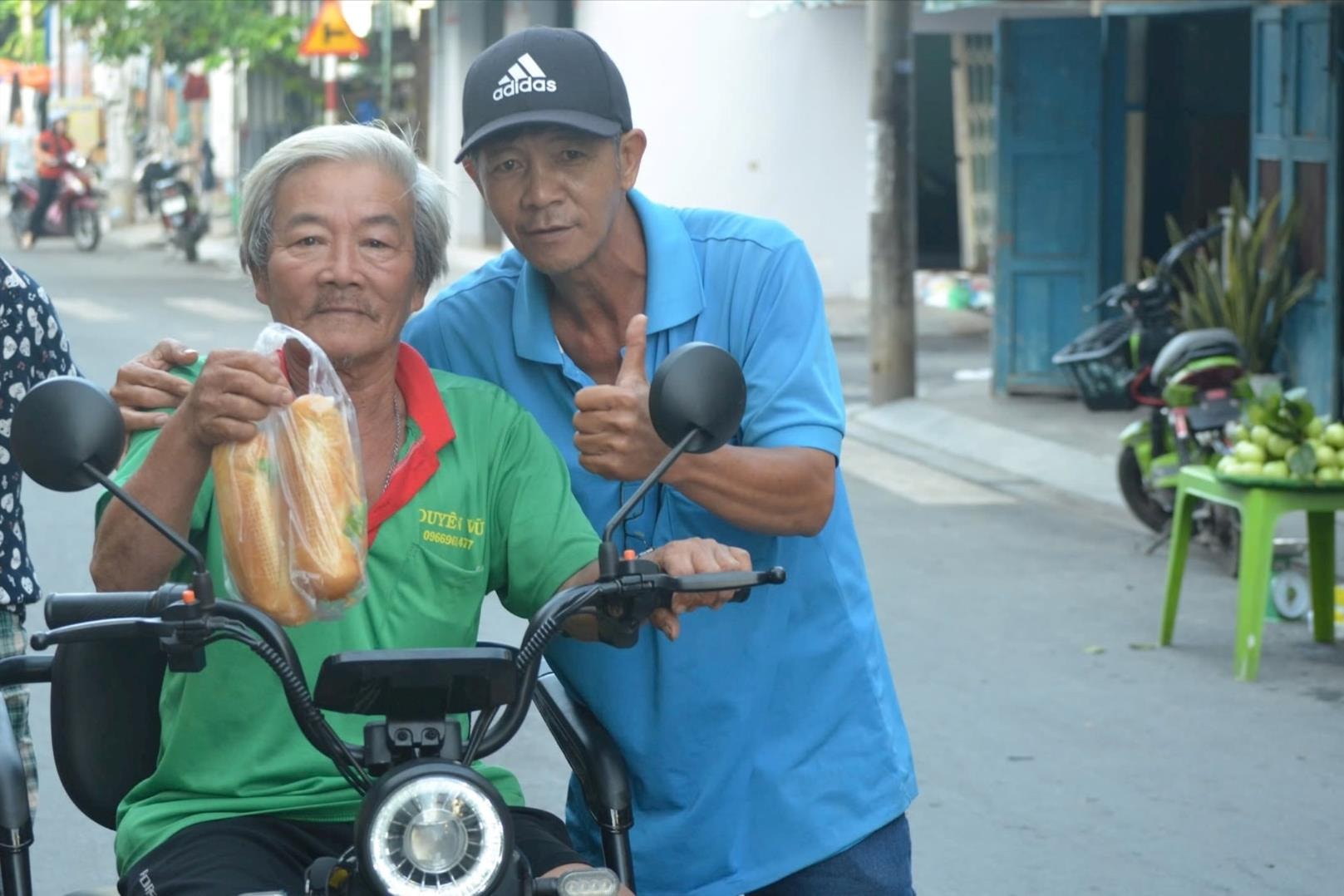 Ông Dương Quang Trí, Chủ nhiệm CLB Chung Tay Vì Người Nghèo La Gi trao tặng bánh mì cho người có hoàn cảnh khó khăn