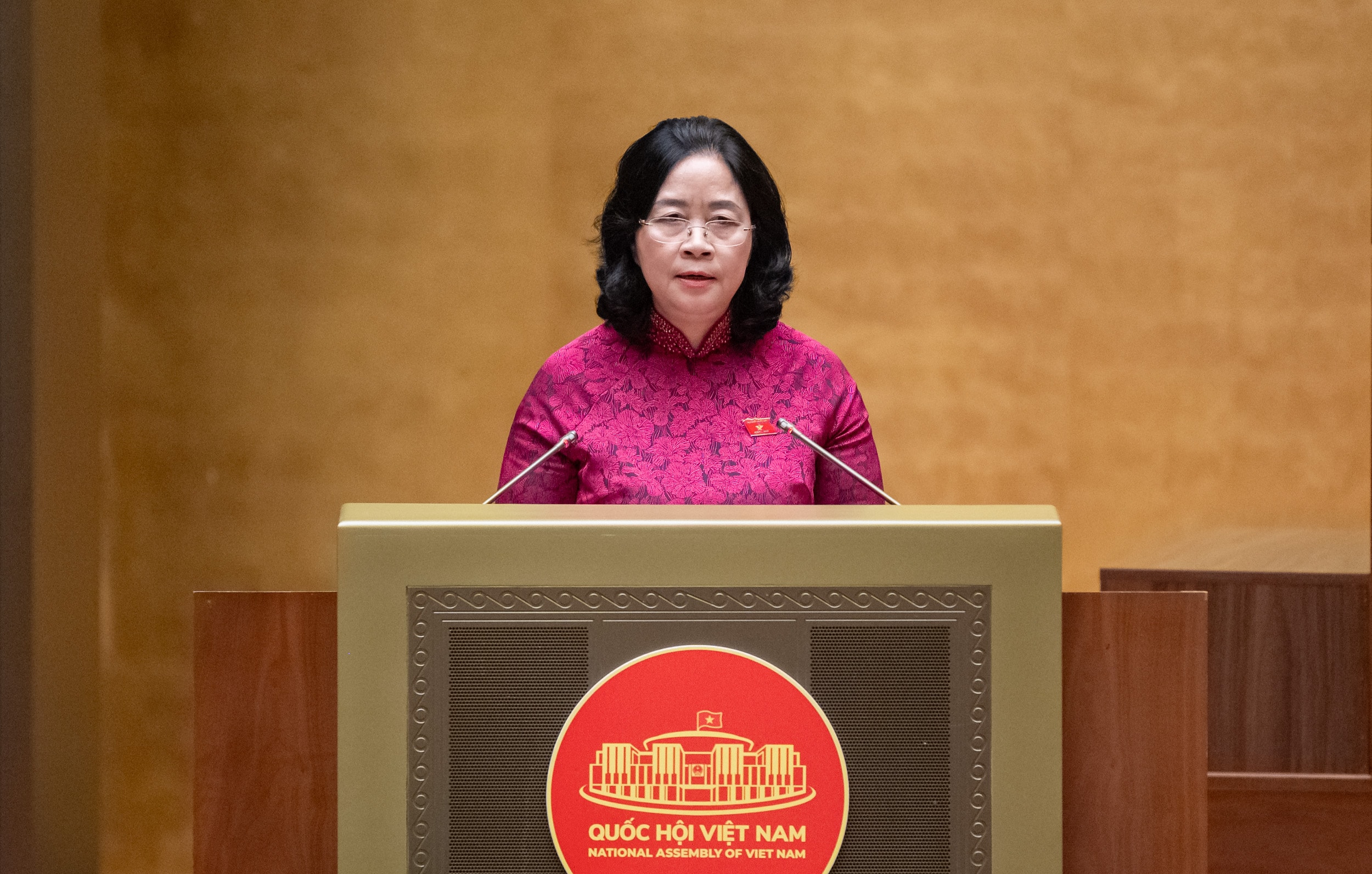 Chủ nhiệm Ủy ban Dân nguyện và Giám sát Lê Thị Nga trình bày Báo cáo kết quả giám sát việc giải quyết, trả lời kiến nghị của cử tri gửi đến Kỳ họp thứ Mười, Quốc hội khóa XV. Ảnh: Phạm Thắng