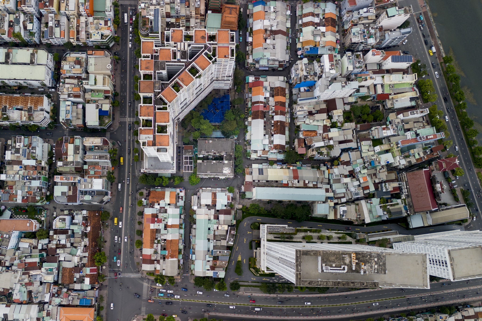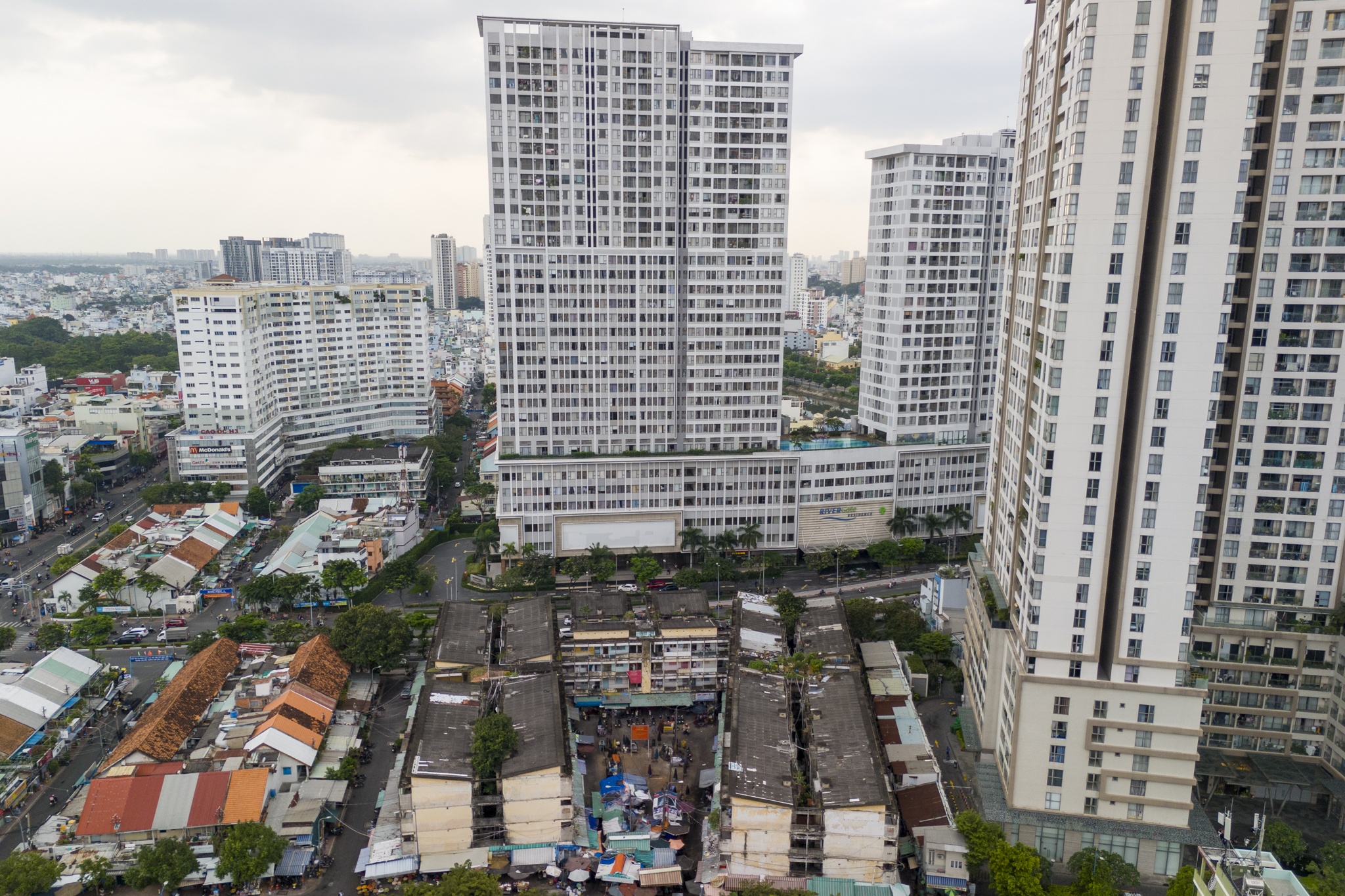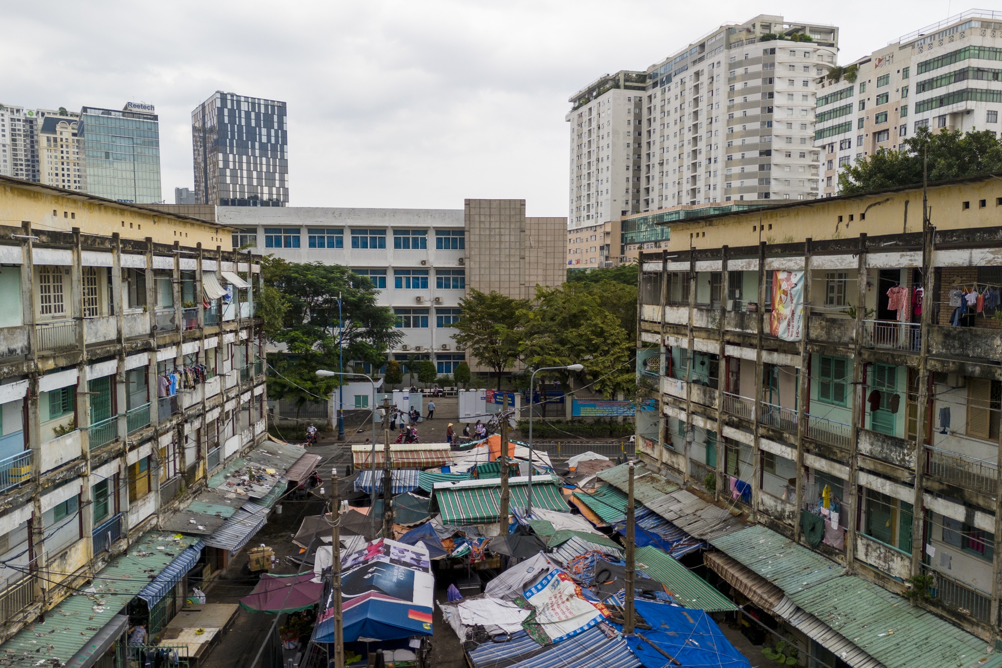 Chung cư cũ Vĩnh Hội (phường Khánh Hội, TP.HCM) nằm lọt thỏm giữa những tòa cao ốc hiện đại. Công trình được xây trước năm 1975, hiện đã xuống cấp nghiêm trọng. Tuy người dân được yêu cầu di dời khẩn cấp từ năm 2017, đến nay mới có 12/244 hộ chịu rời đi.