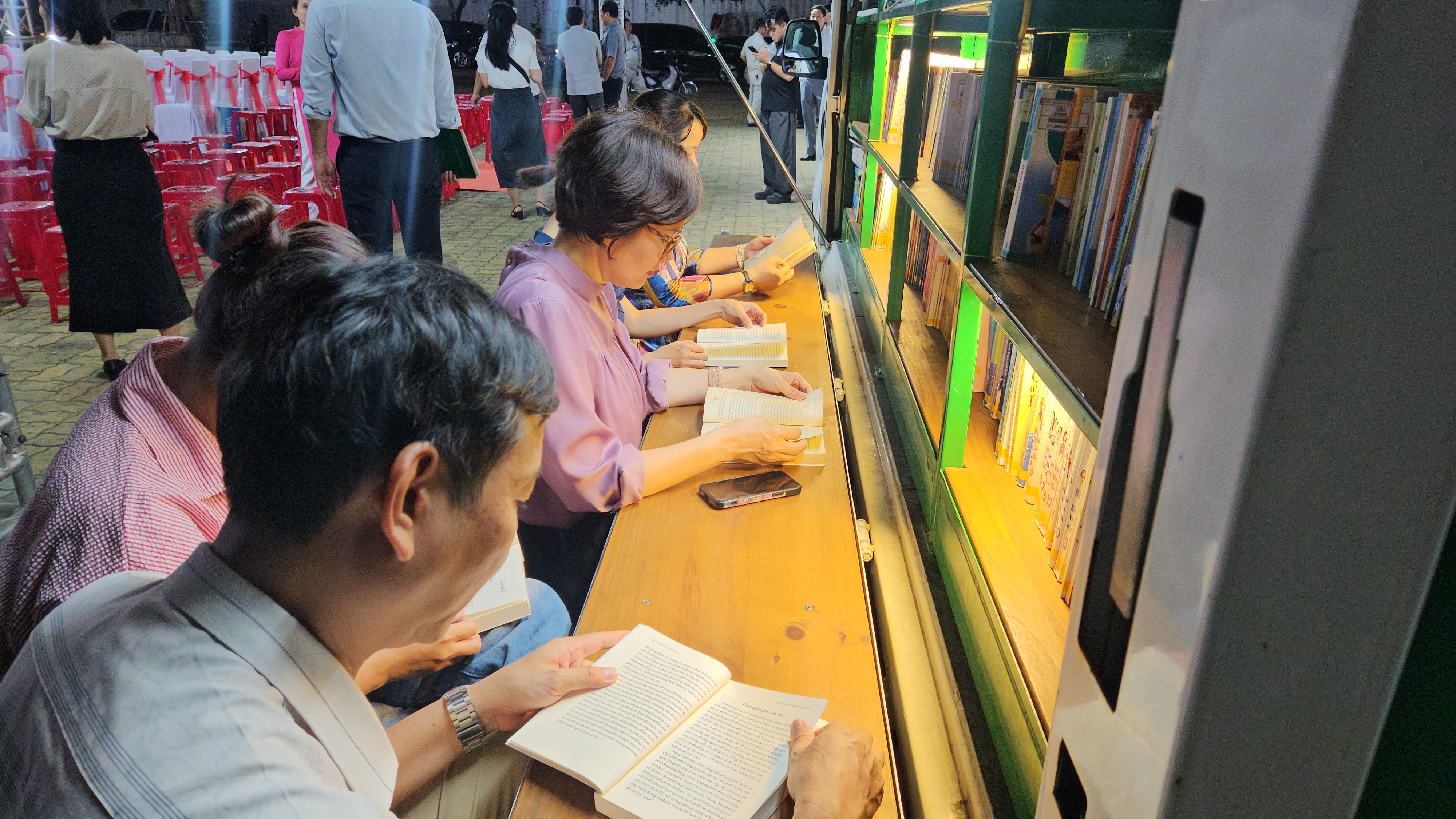 Người dân đọc sách miễn phí tại thư viện lưu động trên xe tải của Thư viện Đà Nẵng. Ảnh: TẤN VIỆT