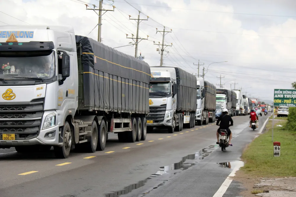 Các phương tiện xếp hàng dài trên Quốc lộ 28.