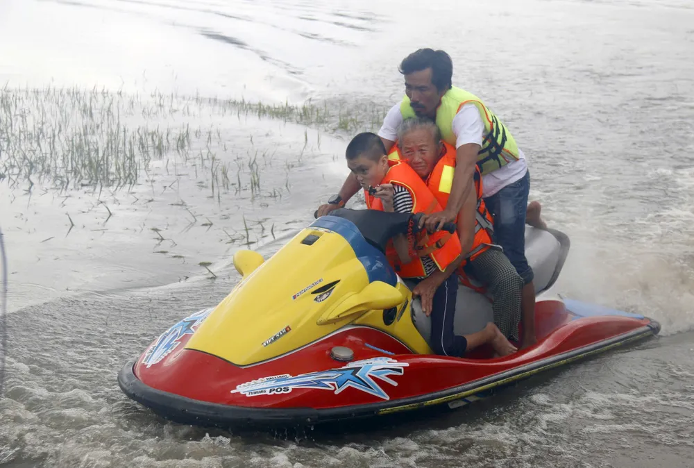 Đội cứu hộ đang tích cực sơ tán người dân tại xã Hàm Thuận.