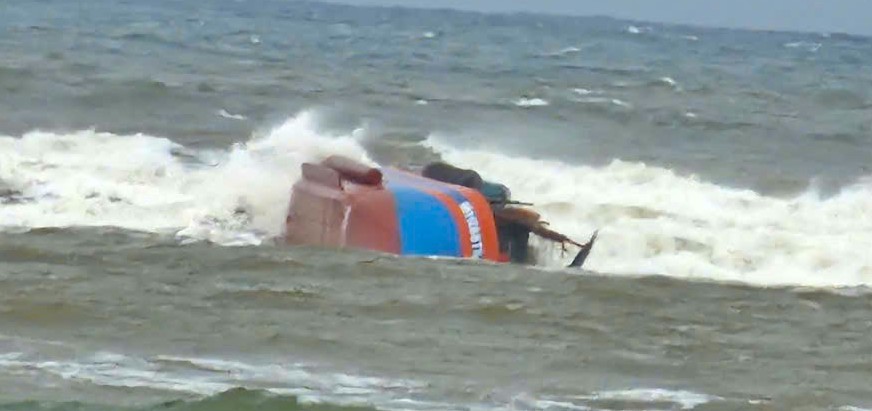 Đến 6h40, tàu khi ra cửa biển, do mắc cạn kèm sóng to gió lớn đã bị đánh chìm cách bờ Mỹ Cảnh khoảng 100m về phía Bắc.