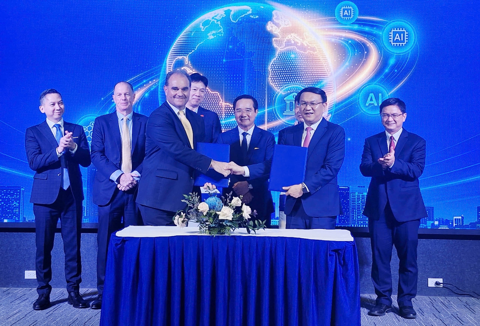 G42 (UAE) và Liên danh nhà đầu tư FPT - Việt Thái ký kết Thỏa thuận khung hợp tác dài hạn có sự chứng kiến của lãnh đạo TP.HCM vào tối 8.2 - Ảnh: Sở KHCN TP.HCM