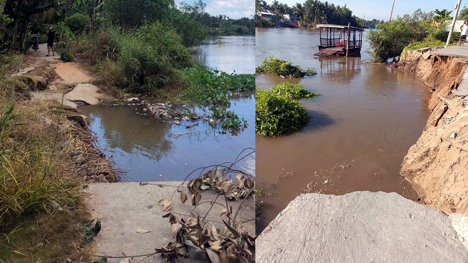 Cụ thể, khoảng 9 giờ sáng 24-4, lực lượng chức năng phát hiện một đoạn lộ đal (đường nông thôn được bê tông hóa bằng các tấm xi măng ghép lại hoặc đổ bê tông liền khối_PV) tại ấp Phụng An bị sụp hoàn toàn xuống sông.