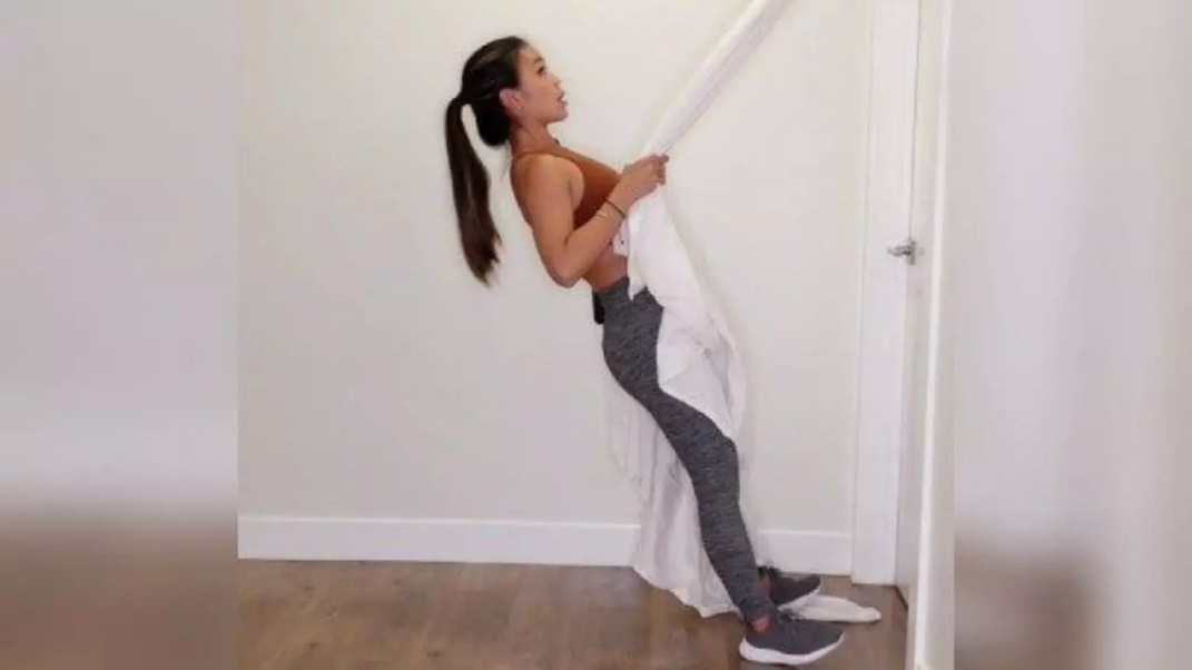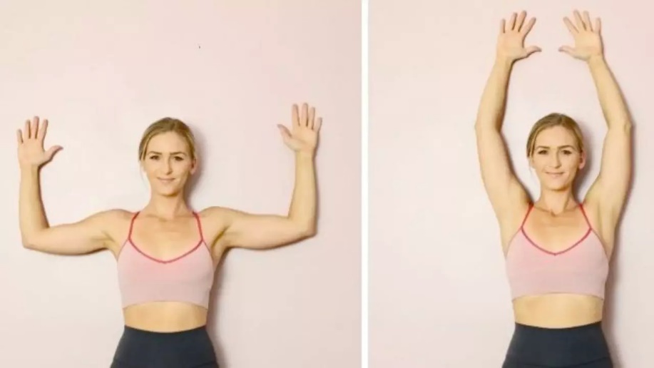 Cách thực hiện: Đứng sát tường, lưng dưới và cổ chạm vào tường, cằm hóp nhẹ, hai chân mở rộng bằng hông. Đặt mu bàn tay lên tường, từ từ di chuyển cánh tay lên xuống, giữ cho lưng và vai tiếp xúc với tường.
