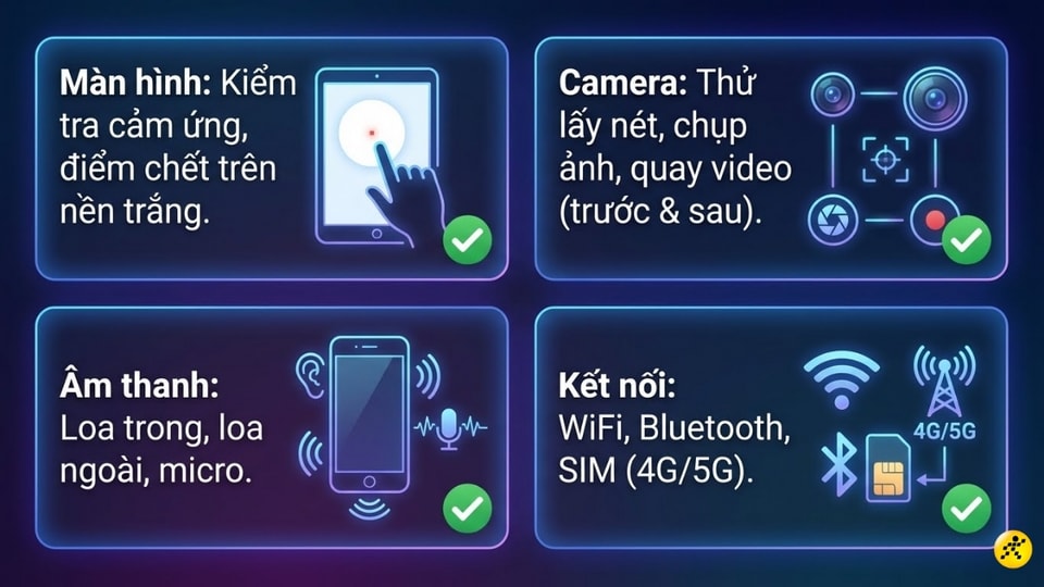Kiểm tra các chức năng cảm ứng, camera và âm thanh của máy.