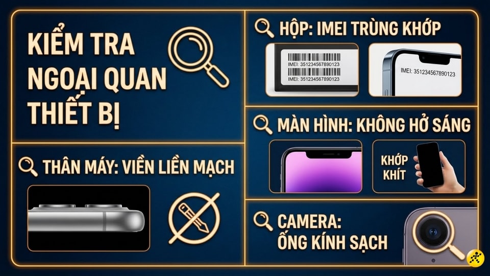 Đối với máy mới nguyên hộp, chữ in trên vỏ phải sắc nét, không nhòe. Đặc biệt, số IMEI in trên hộp phải trùng khớp hoàn toàn với mã số bên trong máy. Với thân máy, cần kiểm tra kỹ các cạnh viền xem có dấu hiệu cạy mở, cấn móp hay bụi lọt vào trong thấu kính camera hay không.