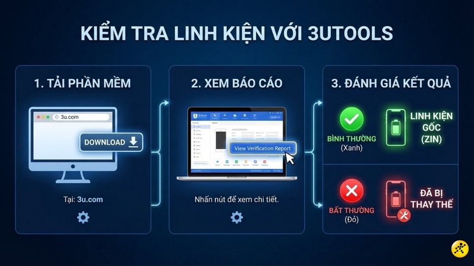 Phần mềm 3uTools trên máy tính giúp quét và báo cáo tình trạng linh kiện bên trong. Khi kết nối iPhone với máy tính, hãy nhấn vào View Verification Report. Các linh kiện hiện màu xanh (Normal) là hàng nguyên bản, trong khi màu đỏ (Abnormal) cảnh báo linh kiện đã bị thay thế.