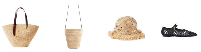 Raffia thường xuất hiện ở phụ kiện như túi cói, mũ rộng vành hay sandal, mang lại cảm giác tự nhiên và gần gũi. Đây là điểm nhấn hoàn hảo cho cả phong cách đi biển lẫn trang phục dạo phố.