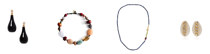 Trang sức từ đá tự nhiên như onyx, lapis hay vỏ sò giúp tổng thể thêm phần nổi bật. So với kim loại truyền thống, những món phụ kiện này mang lại cảm giác tươi mới và giàu cá tính hơn.