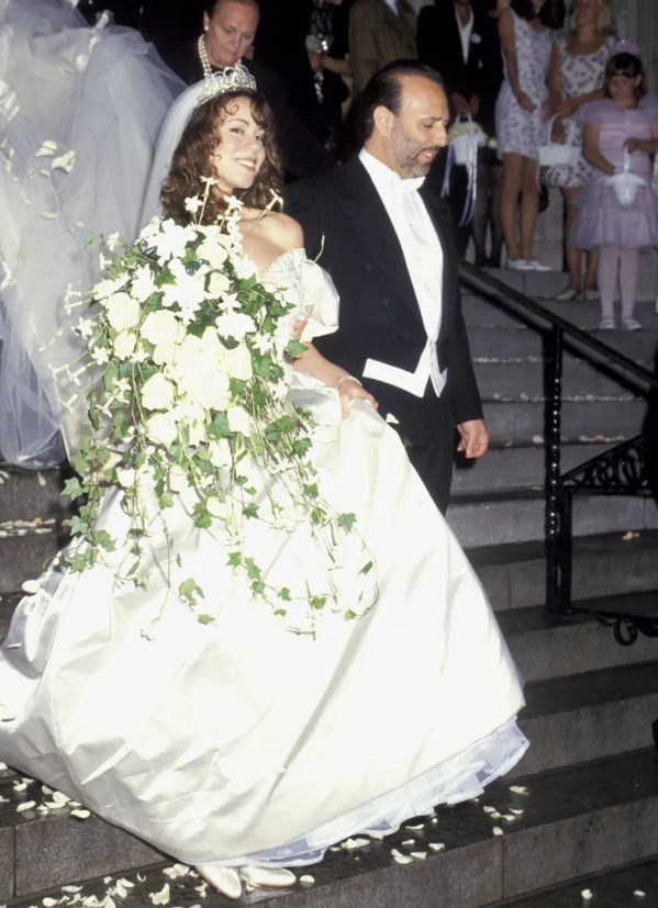Trong lễ cưới năm 1993, Mariah Carey diện chiếc váy cưới lộng lẫy của Vera Wang với tà dài gần 8 mét. Cô kết hợp cùng khăn voan dài, giày kiểu Cinderella và bó hoa trắng khổng lồ.