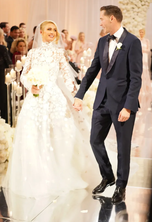 Trong lễ cưới năm 2021, Paris Hilton tỏa sáng với chiếc váy couture của Oscar de la Renta. Thiết kế ren tinh xảo cùng khăn voan thêu hoa mềm mại giúp cô trở thành hình ảnh cô dâu hiện đại đầy sang trọng.