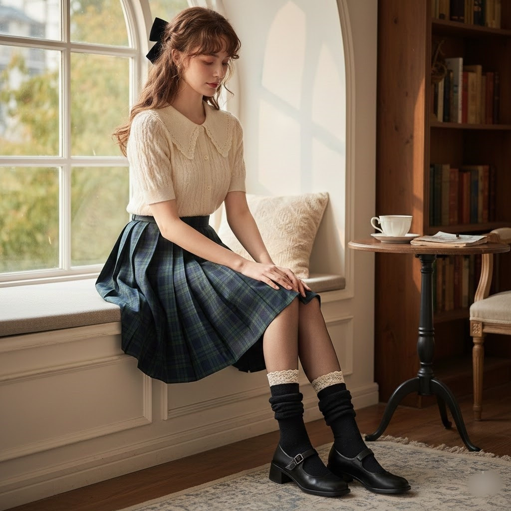 Tất viền ren hoặc tất cao cổ mỏng kết hợp giày Mary Jane tạo điểm nhấn ở cổ chân nhỏ nhắn. Điều này hướng ánh nhìn vào phần chân thon, khiến tổng thể thanh mảnh và nữ tính hơn.