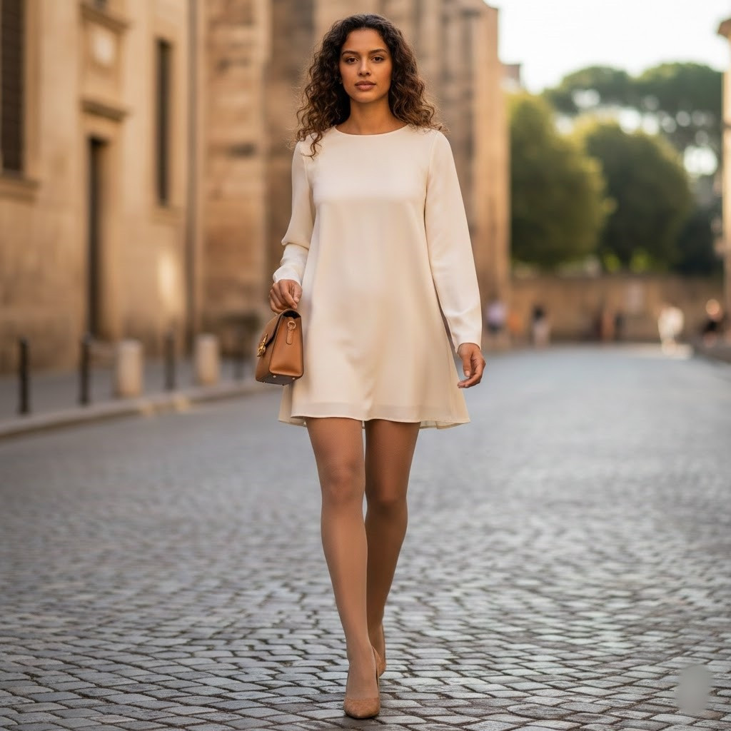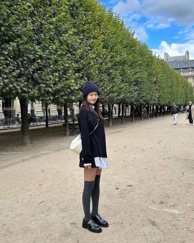 Sự liền mạch giữa quần tất đen mỏng và chân váy tối màu tạo cảm giác “chân biến mất” vào trang phục. Không chỉ che khuyết điểm, combo này còn giúp kéo dài chân một cách tinh tế.