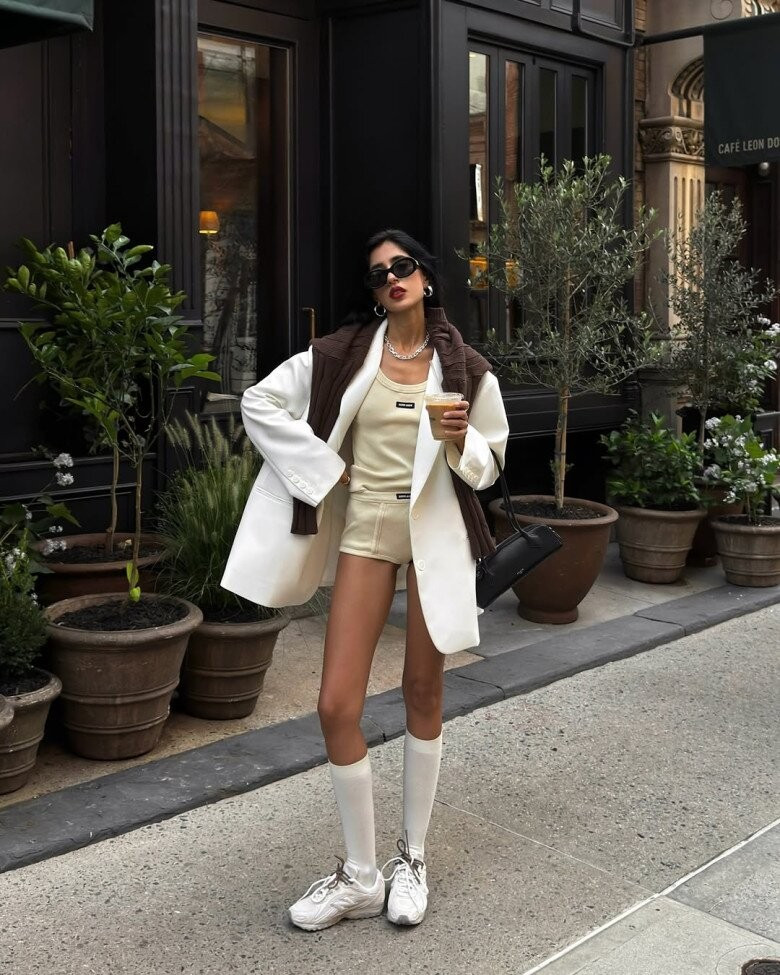Giày thể thao trắng và tất trắng cổ ngắn kết hợp với nhau tạo nên sự đồng nhất, giúp bàn chân không bị chia cắt thị giác. Khi kết hợp cùng quần jean hoặc váy chữ A cạp cao, đôi chân trông dài và cân đối hơn.