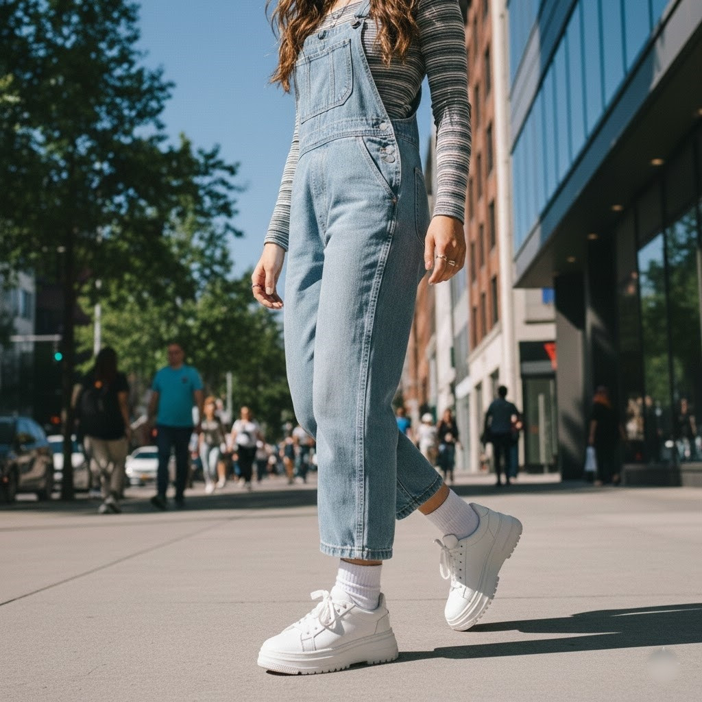 Giày đế dày từ 3–5cm giúp tăng chiều cao trực tiếp. Khi đi cùng tất đen hoặc xám, cổ chân trông nhỏ gọn hơn, cân bằng lại sự “đồ sộ” của giày đế bánh mì.