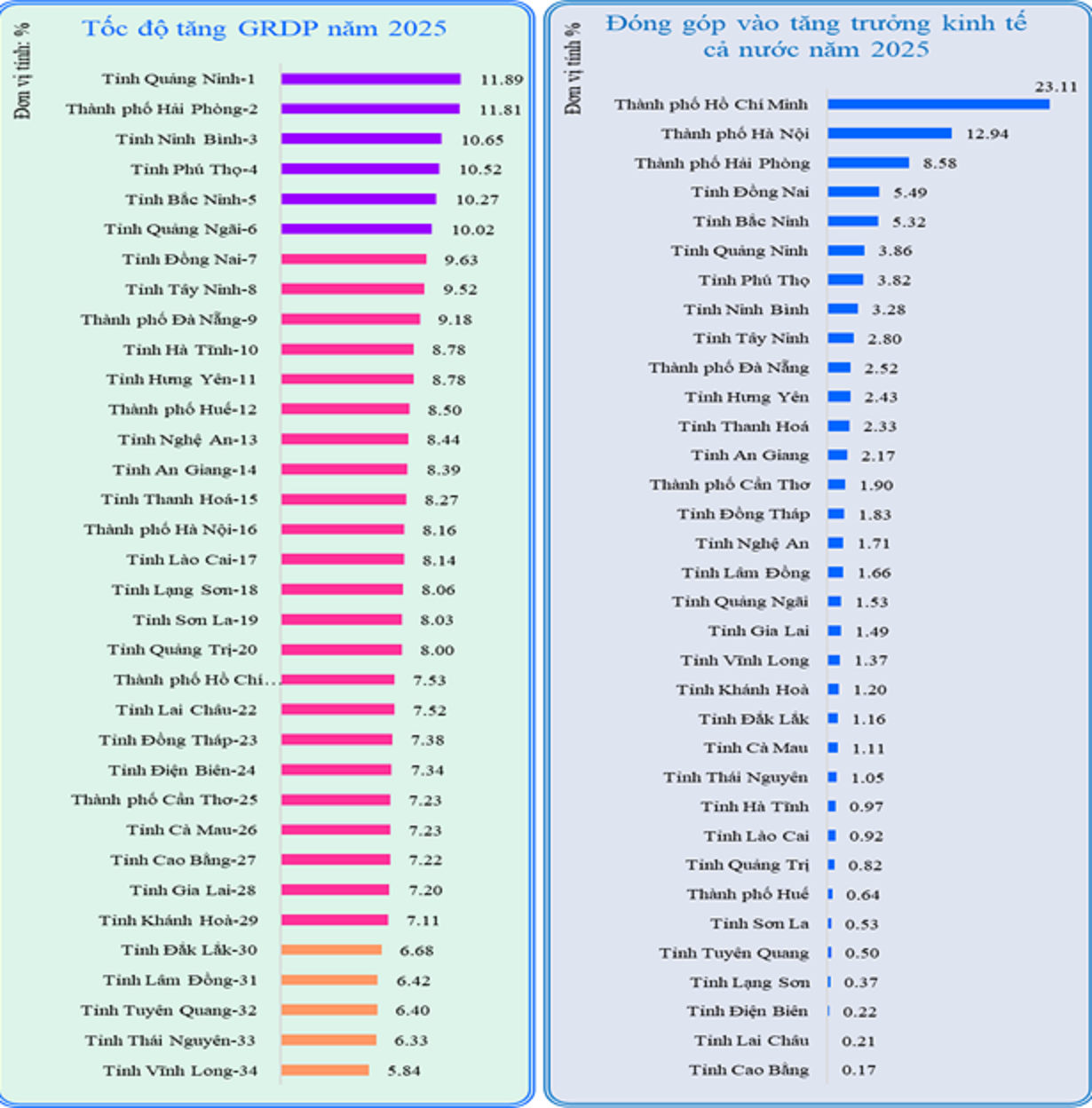 Trong khi đó, Thành phố Hà Nội xếp thứ 16 với mức tăng trưởng GRDP 8,16% và TP.HCM xếp thứ 21 với mức tăng trưởng 7,53%. Tuy không lọt TOP 10 nhưng 2 thành phố này cùng với Hải Phòng, Đồng Nai và Bắc Ninh tiếp tục giữ vai trò trụ cột của nền kinh tế, đóng góp lớn nhất vào tăng trưởng GDP cả nước. Đây là 5 địa phương có quy mô kinh tế lớn nhất cả nước; năm 2025, nhóm này đóng góp đến 55,4% vào tăng trưởng cả nước.