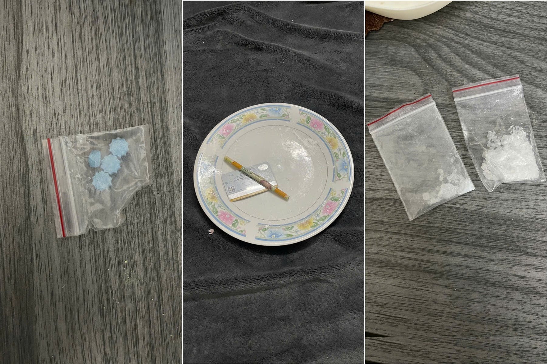 Tại hiện trường, công an thu giữ: 01 đĩa sứ có hoa văn, trên đĩa có 01 thẻ ngân hàng, 01 tờ tiền mệnh giá 10.000 đồng được cuộn tròn và các hạt tinh thể màu trắng nghi là ma túy; 02 túi nylon chứa tinh thể màu trắng; 01 túi nylon chứa các viên nén màu xanh lam; 12 điện thoại di động cùng nhiều tang vật có liên quan.