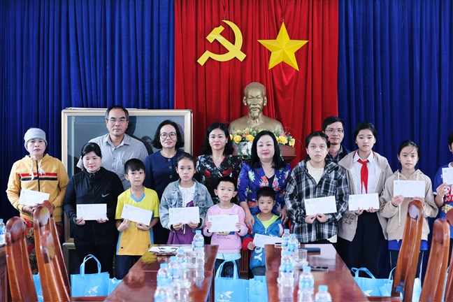 Ủy viên Trung ương Đảng, Phó Chủ tịch Ủy ban Trung ương MTTQ Việt Nam, Chủ tịch Hội LHPN Việt Nam Nguyễn Thị Tuyến (hàng sau, thứ 3 từ trái sang) và lãnh đạo tỉnh Đắk Lắk trao quà hỗ trợ cho các hội viên, phụ nữ, trẻ mồ côi có hoàn cảnh khó khăn bị ảnh hưởng bởi bão lũ vừa qua tại phường Hòa Thịnh