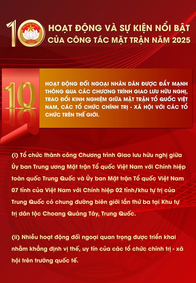 10. Hoạt động đối ngoại nhân dân được đẩy mạnh thông qua các chương trình giao lưu hữu nghị, trao đổi kinh nghiệm giữa Mặt trận Tổ quốc Việt Nam, các tổ chức chính trị - xã hội với các tổ chức trên thế giới.