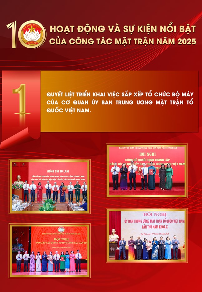 Trước những thành công đó, Ban Thường trực Ủy ban Trung ương MTTQ Việt Nam xin giới thiệu 10 hoạt động và sự kiện nổi bật của công tác Mặt trận năm 2025.