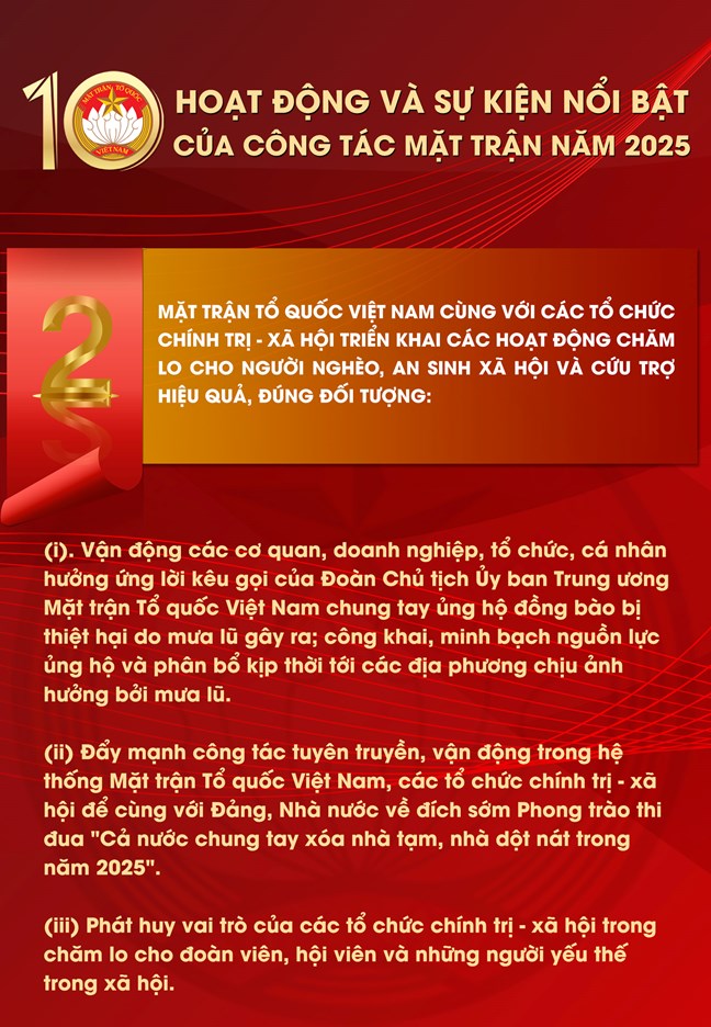 2. Mặt trận Tổ quốc Việt Nam cùng với các tổ chức chính trị - xã hội triển khai các hoạt động chăm lo cho người nghèo, an sinh xã hội và cứu trợ hiệu quả, đúng đối tượng: