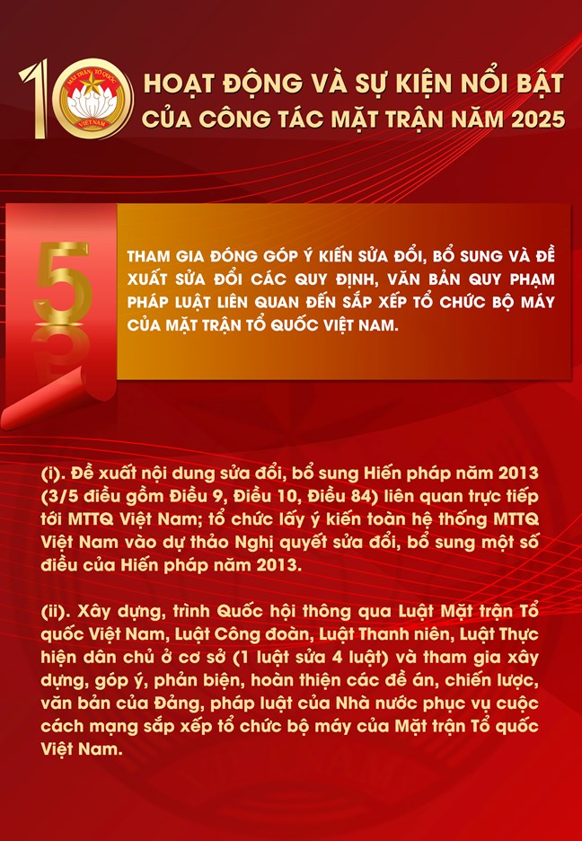 (i). Đề xuất nội dung sửa đổi, bổ sung Hiến pháp năm 2013 (3/5 điều gồm Điều 9, Điều 10, Điều 84) liên quan trực tiếp tới MTTQ Việt Nam; tổ chức lấy ý kiến toàn hệ thống MTTQ Việt Nam vào dự thảo Nghị quyết sửa đổi, bổ sung một số điều của Hiến pháp năm 2013.