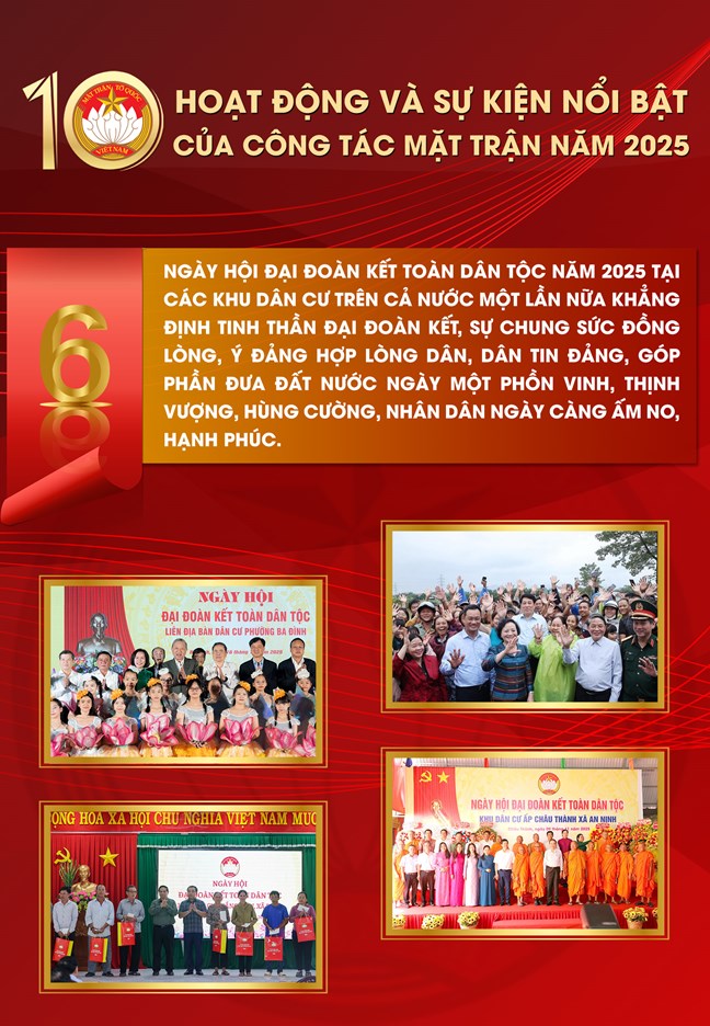 6. Ngày hội đại đoàn kết toàn dân tộc năm 2025 tại các khu dân cư trên cả nước một lần nữa khẳng định tinh thần đại đoàn kết, sự chung sức đồng lòng, ý Đảng hợp lòng dân, dân tin Đảng, góp phần đưa đất nước ngày một phồn vinh, thịnh vượng, hùng cường, nhân dân ngày càng ấm no, hạnh phúc.