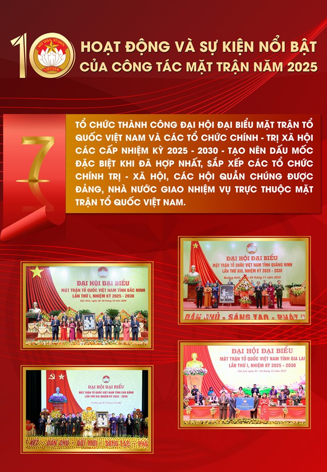 7. Tổ chức thành công Đại hội đại biểu Mặt trận Tổ quốc Việt Namvà các tổ chức chính trị - xã hội các cấp nhiệm kỳ 2025 - 2030 - Tạo nên dấu mốc đặc biệt khi đã hợp nhất, sắp xếp các tổ chức chính trị - xã hội, các hội quần chúng được Đảng, Nhà nước giao nhiệm vụ trực thuộc Mặt trận Tổ quốc Việt Nam.