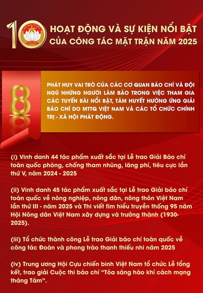 8. Phát huy vai trò của các cơ quan báo chí và đội ngũ những người làm báo trong việc tham gia các tuyến bài nổi bật, tâm huyết hưởng ứng Giải báo chí do MTTQ Việt Nam và các tổ chức chính trị - xã hội phát động.