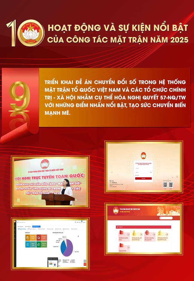 9. Triển khai Đề án chuyển đổi số trong hệ thống Mặt trận Tổ quốc Việt Nam và các tổ chức chính trị - xã hội nhằm cụ thể hóa Nghị quyết 57-NQ/TW với những điểm nhấn nổi bật, tạo sức chuyển biến mạnh mẽ.