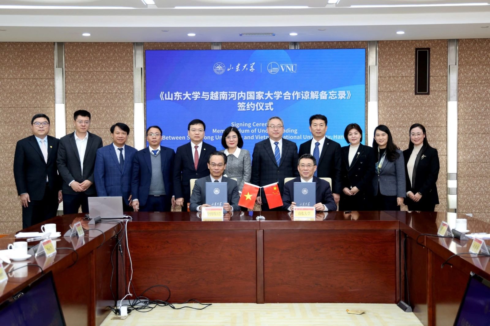 Giám đốc ĐHQGHN Hoàng Minh Sơn và Phó Giám đốc thường trực ĐH Sơn Đông Ngô Trân trao văn bản thỏa thuận hợp tác toàn diện giữa hai đại học