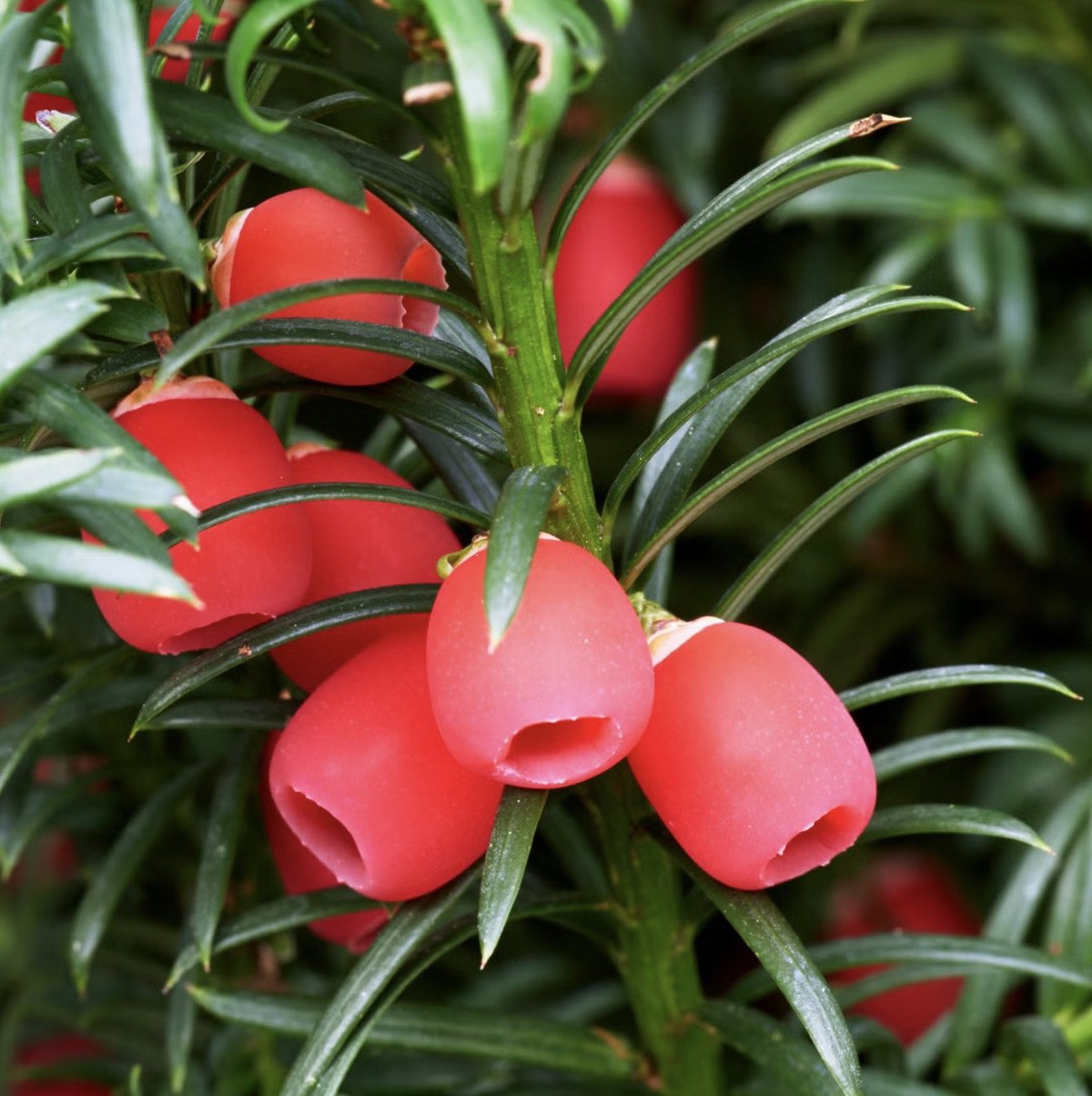 Cây thủy tùng thường trồng làm cảnh với lá kim xanh bóng quanh năm và quả đỏ tươi. Tuy nhiên, tất cả bộ phận của cây đều chứa taxine, gây run cơ hoặc chết đột ngột ở động vật, và gây khó thở, chóng mặt, co giật ở người. Ảnh: Internet