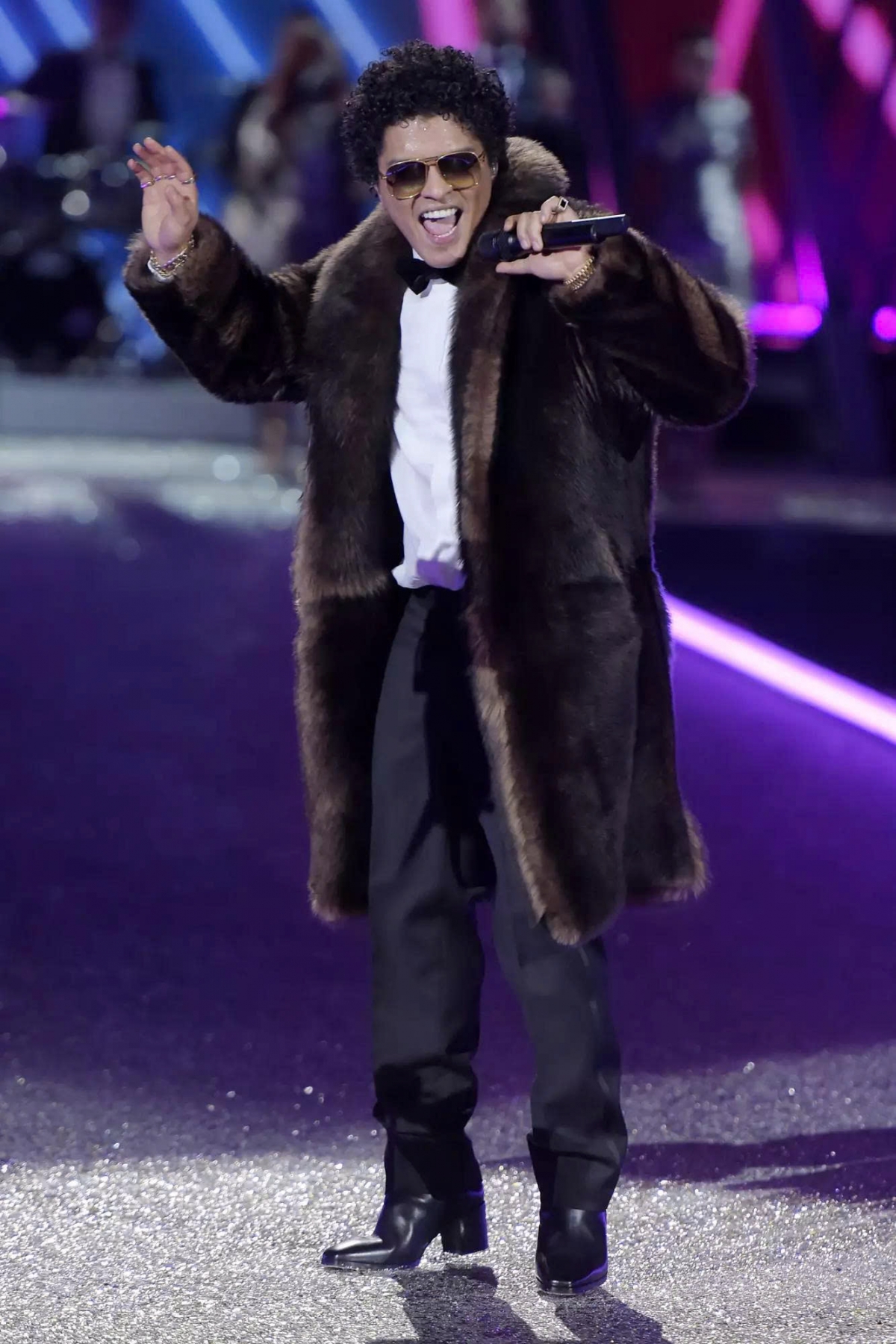 Bruno Mars từng xuất hiện hai lần trên sàn diễn Victoria’s Secret, nhưng màn trình diễn năm 2016 tại Paris mới thật sự là huyền thoại. Với “24K Magic” và phong thái biểu diễn bùng nổ, anh biến từng lời ca thành sân khấu funk nóng bỏng, khiến mọi khán giả phải nhún nhảy theo.