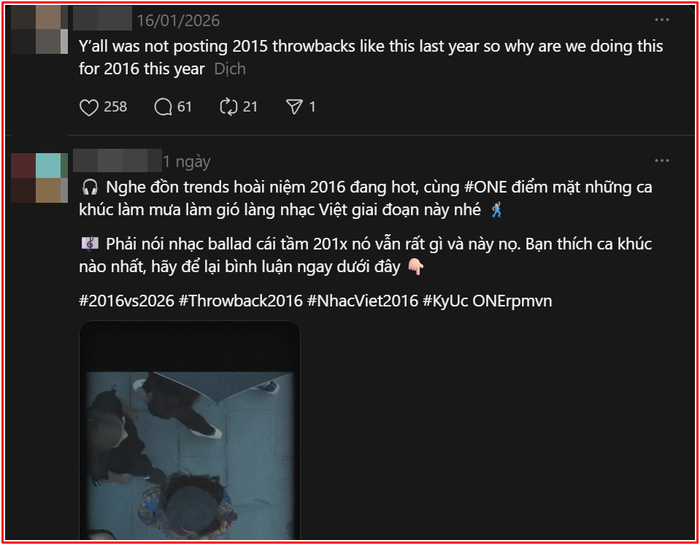 Những ngày đầu năm 2026, mạng xã hội Việt Nam lẫn thế giới đang chứng kiến sự bùng nổ của trào lưu "Throwback 2016" hay "hồi tưởng 2016". Từ Facebook, Instagram đến TikTok, hàng loạt người dùng đồng loạt chia sẻ lại hình ảnh, video và kỷ niệm của bản thân cách đây tròn một thập kỷ. Nhiều người xem đây là dịp để nhìn lại tuổi trẻ, những năm tháng sôi nổi trước khi thế giới bước sang thời kỳ thay đổi chóng mặt của công nghệ, âm nhạc và đời sống.