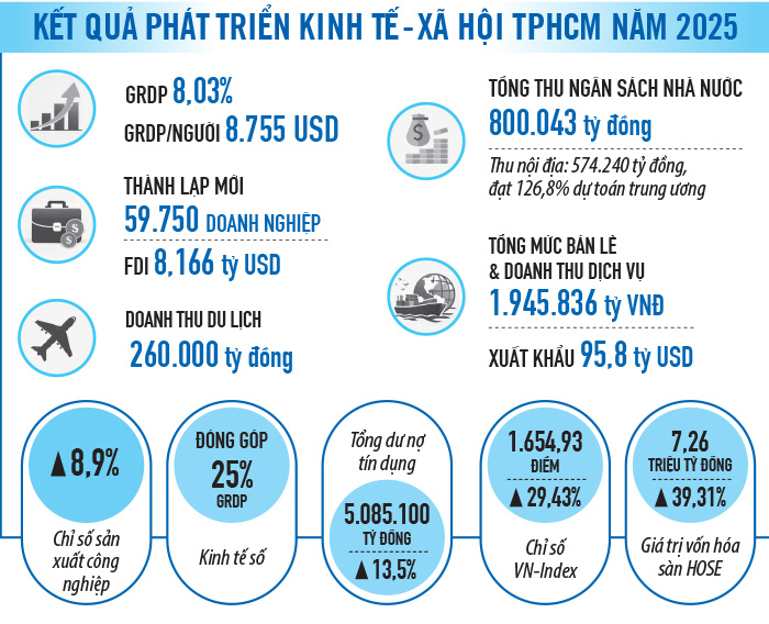Kinh tế thành phố tiếp tục giữ vai trò đầu tàu của cả nước, tăng trưởng 8,03%. Tổng thu ngân sách nhà nước trên địa bàn đạt hơn 800.000 tỷ đồng, vượt xa dự toán, trong đó thu nội địa chiếm tỷ trọng chủ đạo với mức tăng trên 26%. Hoạt động đầu tư và sản xuất kinh doanh khởi sắc rõ nét khi có gần 60.000 doanh nghiệp thành lập mới, tổng vốn đăng ký và bổ sung hơn 2 triệu tỷ đồng; thu hút vốn đầu tư nước ngoài đạt trên 8,1 tỷ USD, tăng hơn 20% so với năm trước.