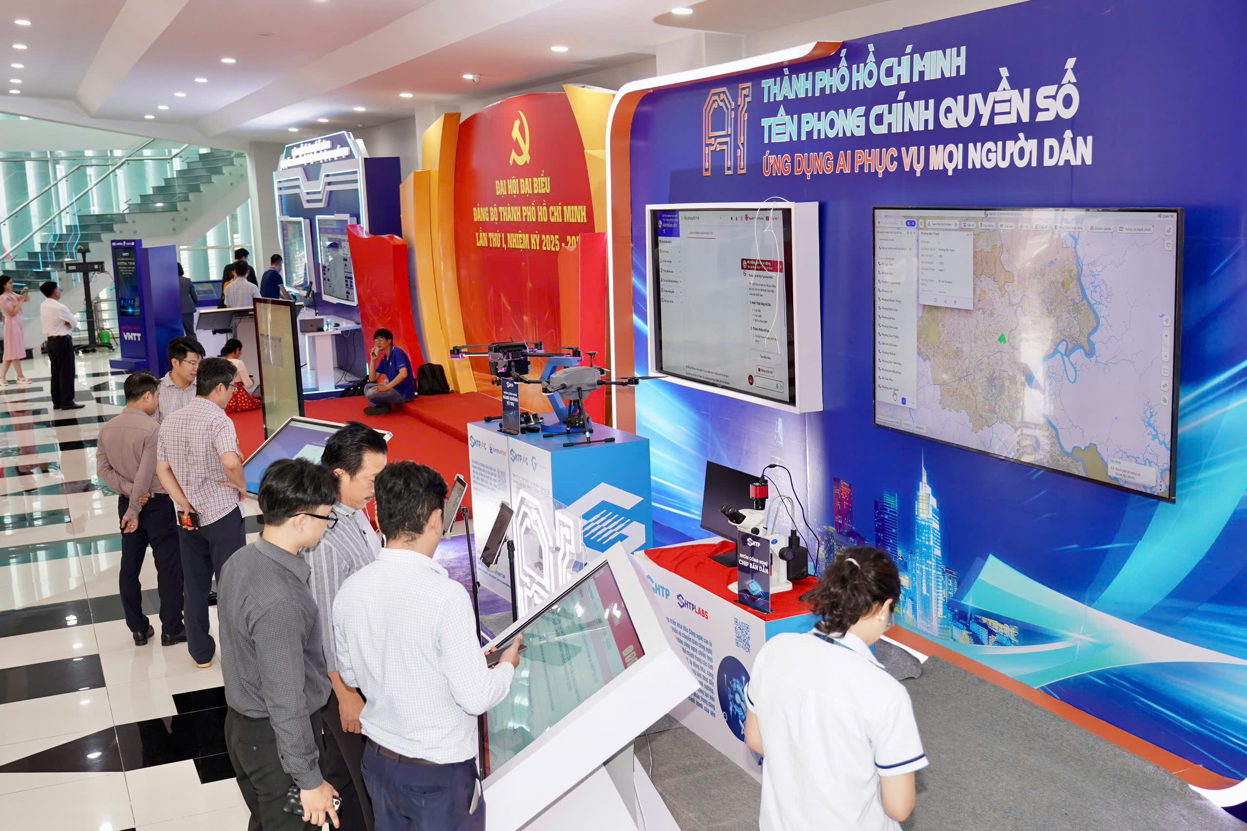 Không gian giới thiệu chính quyền số, bản đồ số và robot AI tại Đại hội Đại biểu Đảng bộ TPHCM lần I. Ảnh: HOÀNG HÙNG