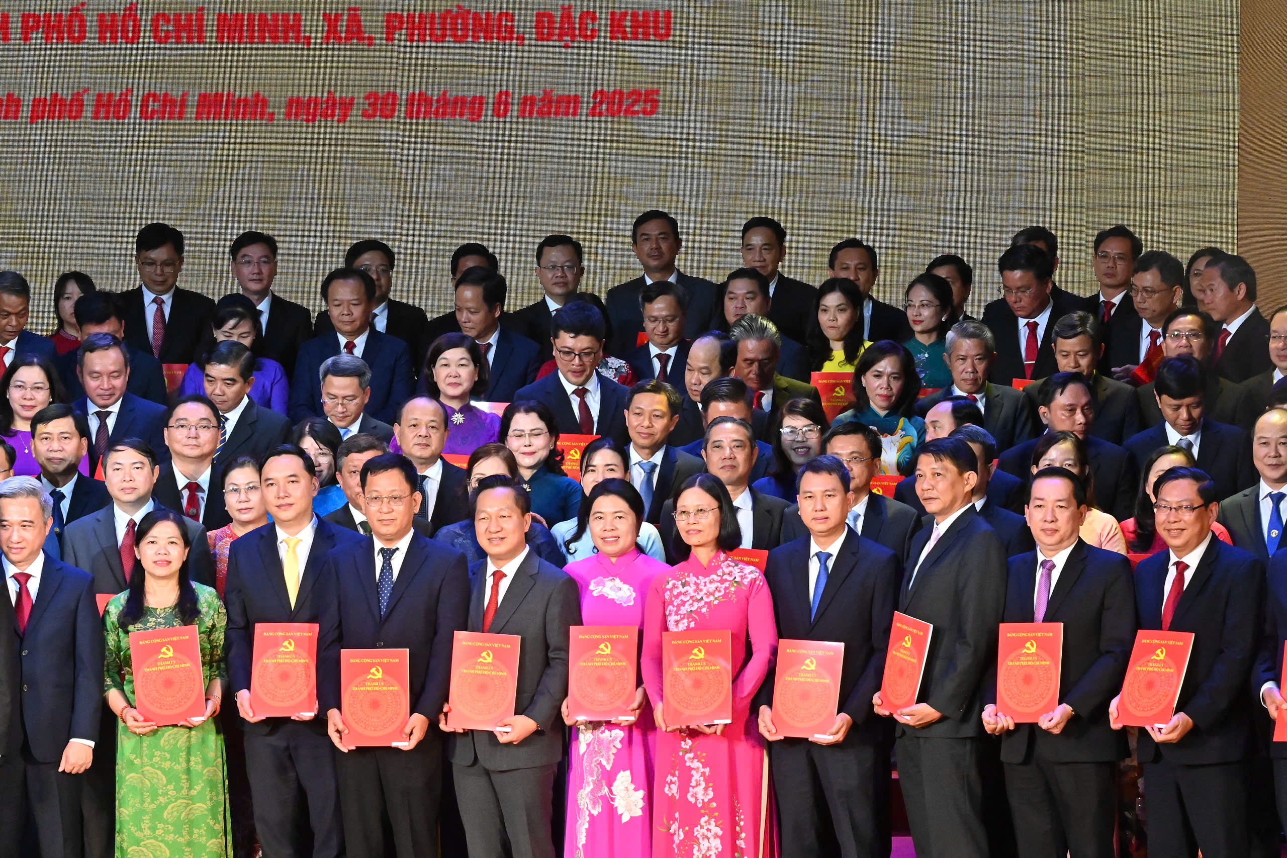 Trao quyết định cán bộ các xã, phường, đặc khu tại TPHCM khi thực hiện Nghị quyết 18 của Ban Chấp hành Trung ương Đảng khóa XII. Ảnh: VIỆT DŨNG