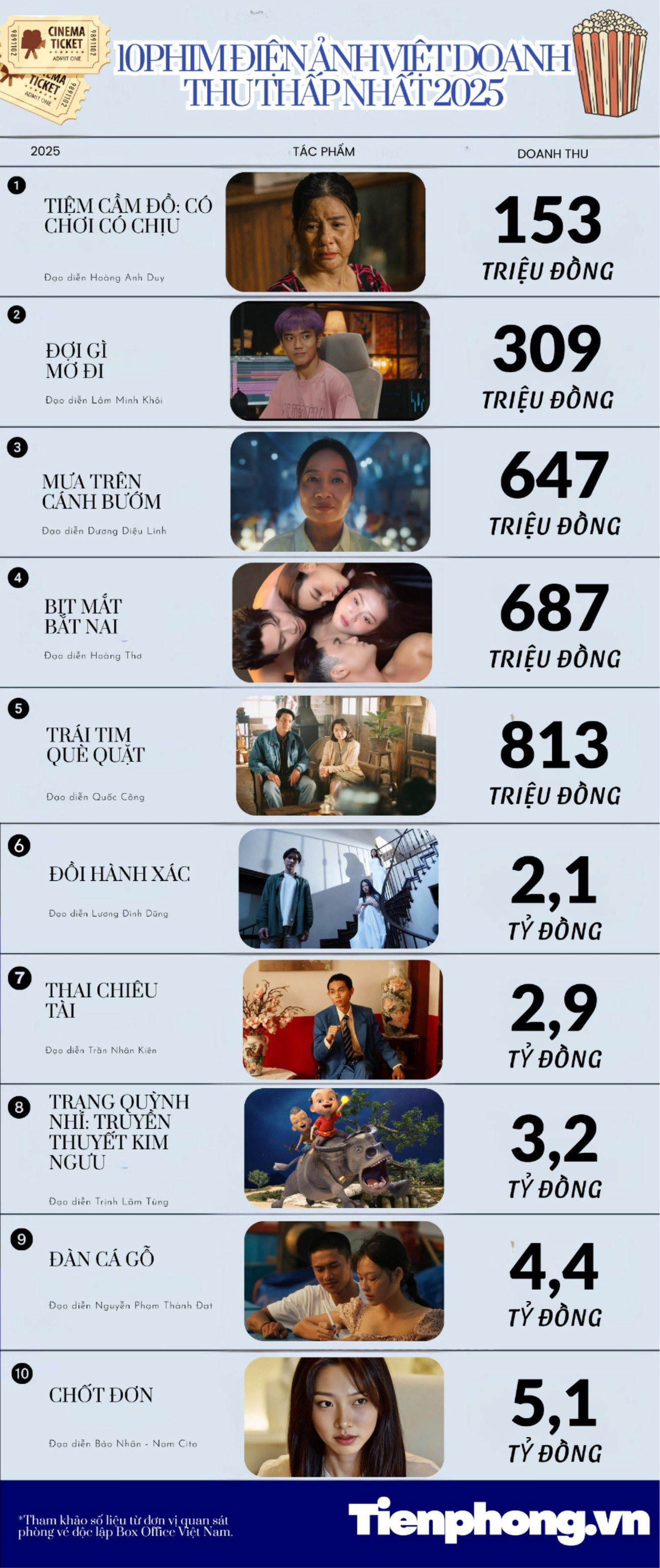 Bên cạnh loạt phim trăm tỷ đồng, phòng vé Việt 2025 chứng kiến phần đối lập là 10 bộ phim đang chia nhau những vị trí lỗ nặng nhất năm.