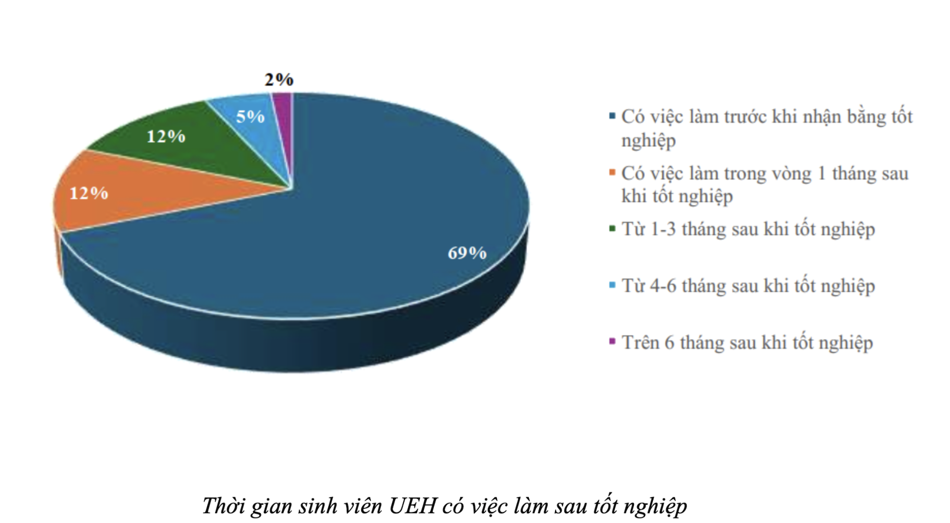 Đáng chú ý, 69% sinh viên có việc làm ngay trước khi nhận bằng, 12% tìm được việc trong vòng một tháng sau tốt nghiệp và chỉ khoảng 2% mất trên 6 tháng để có việc làm. Kết quả này cho thấy khả năng thích ứng nhanh của sinh viên UEH với thị trường lao động.