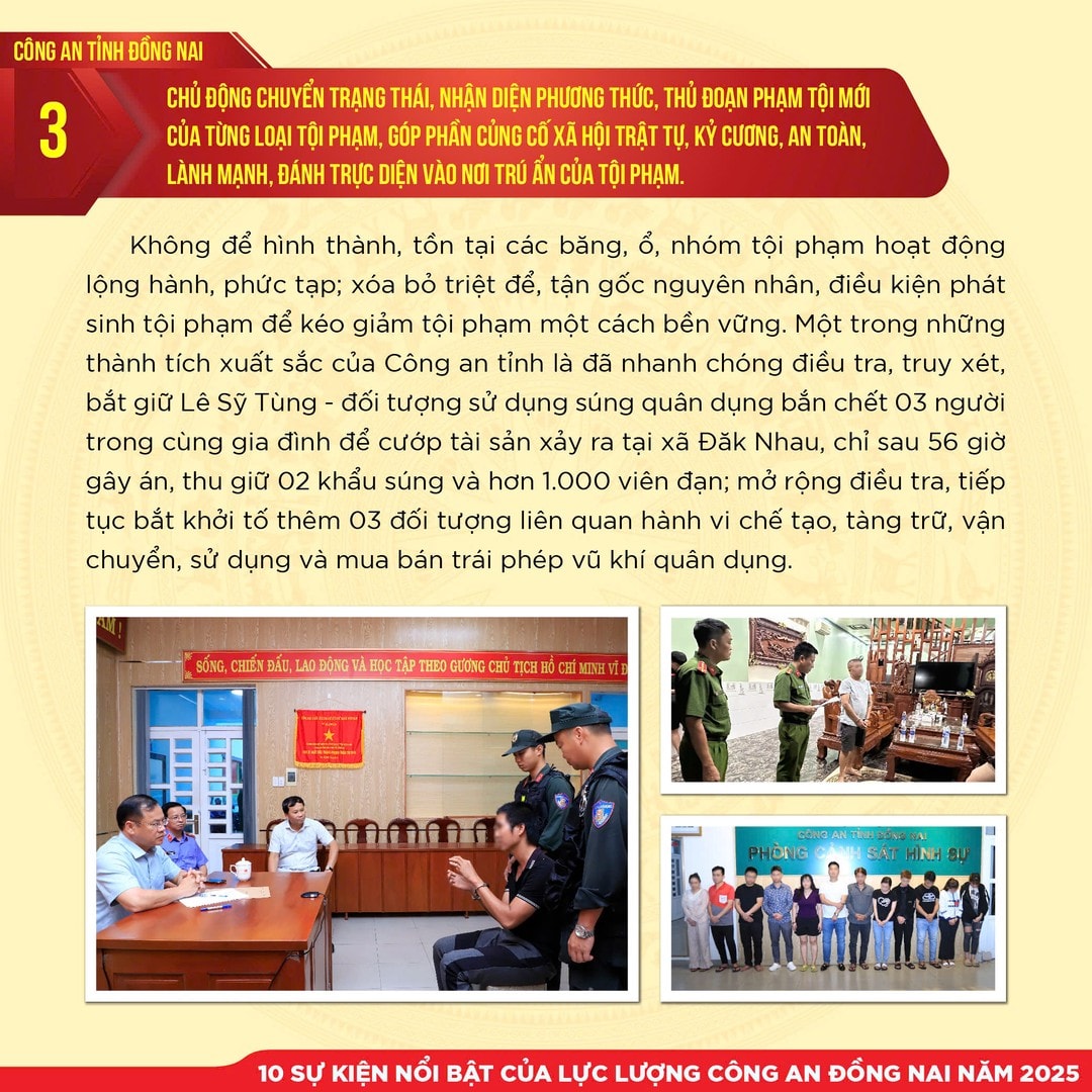 Năm 2025 ghi dấu nhiều bước chuyển mình quan trọng của Công an tỉnh Đồng Nai trong việc triển khai các kế hoạch bảo đảm an ninh quốc gia và trật tự an toàn xã hội. Những kết quả này không chỉ khẳng định tinh thần quyết liệt trong đấu tranh với các loại tội phạm mà còn thể hiện nỗ lực hiện đại hóa lực lượng theo hướng tinh nhuệ.