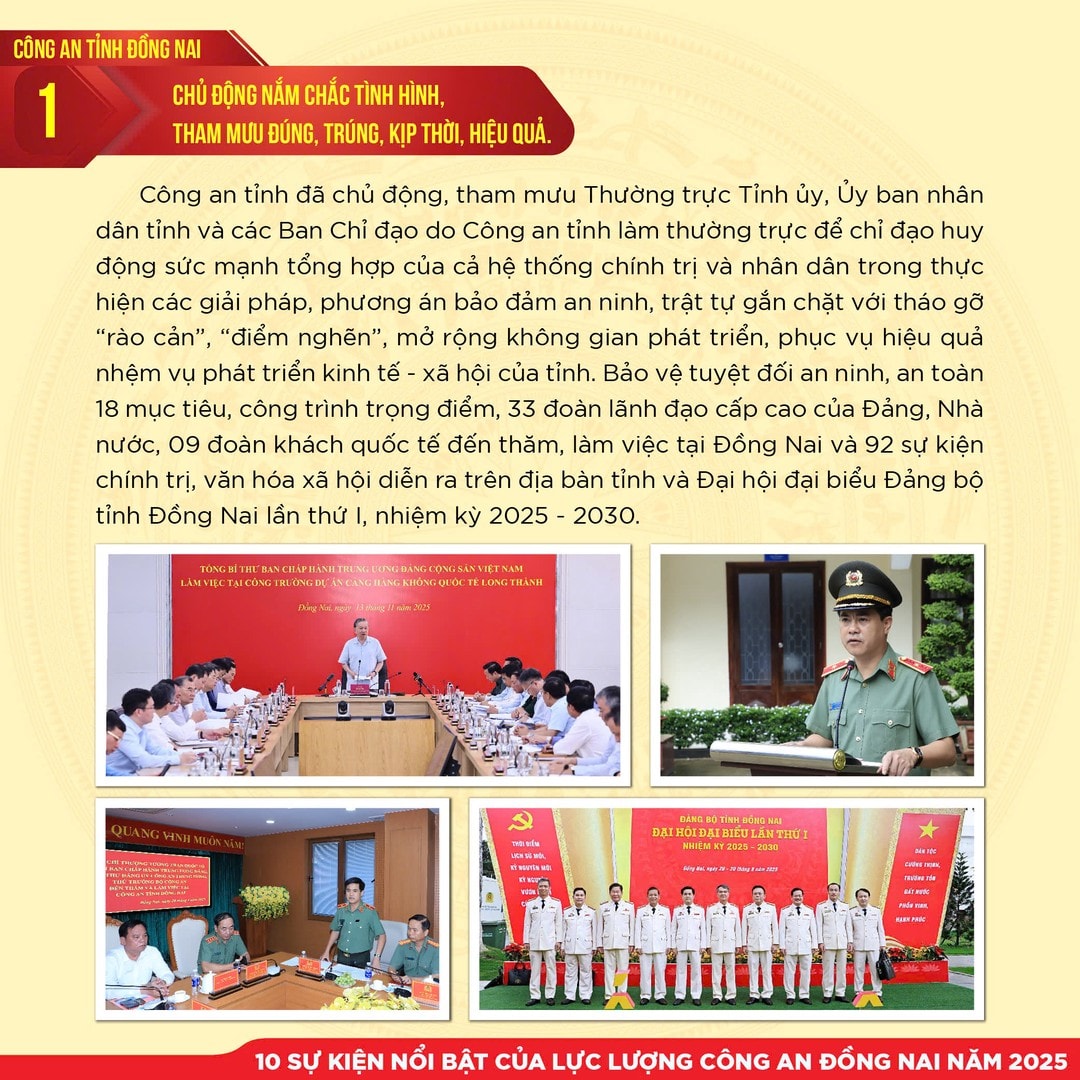 Với những kết quả đã đạt được, Công an tỉnh Đồng Nai đặt mục tiêu tiếp tục phát huy sức mạnh tổng hợp, chủ động nắm chắc tình hình để không bị động, bất ngờ trong mọi tình huống. Trọng tâm vẫn là bảo vệ tuyệt đối an toàn các sự kiện chính trị quan trọng và cuộc sống bình yên của nhân dân.