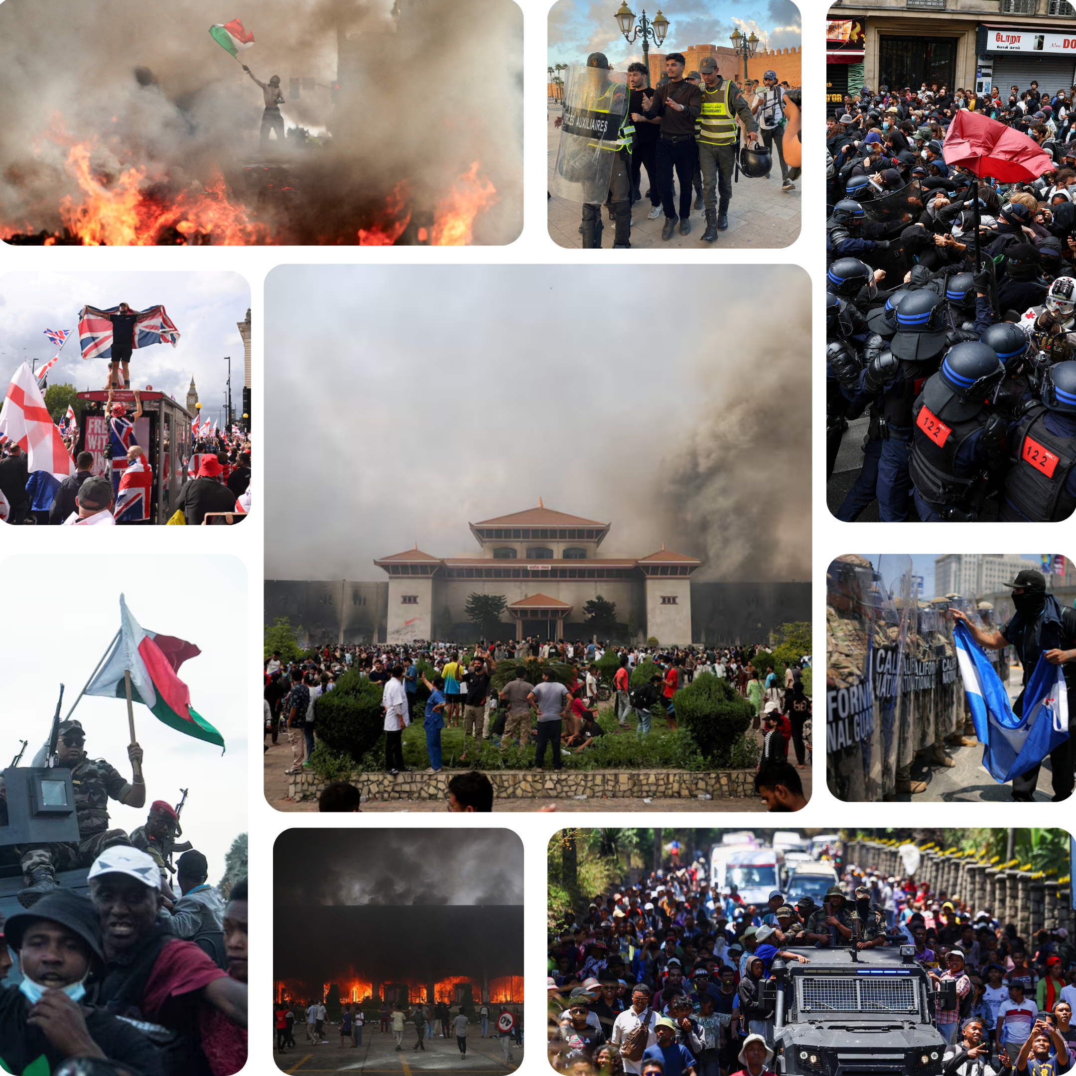 Năm 2025, các cuộc biểu tình và bạo loạn xảy ra tại nhiều quốc gia trên toàn cầu, phản ánh mức độ bất ổn xã hội lan rộng. Dù bối cảnh chính trị và thể chế khác nhau, các cuộc biểu tình có nhiều điểm chung là khởi phát từ khủng hoảng kinh tế - xã hội, do tham nhũng, quản lý yếu kém... Tại Nepal, làn sóng biểu tình bùng lên vào ngày 8/9 sau quyết định của chính phủ đóng cửa 26 nền tảng mạng xã hội. Hiệu ứng dây chuyền từ Nepal đã lan sang Madagascar, nơi người dân xuống đường phản đối tình trạng thiếu điện, thiếu nước, chi phí sinh hoạt leo thang và vấn nạn tham nhũng. Các cuộc biểu tình này đều tổ chức phi tập trung, dựa hoàn toàn vào mạng xã hội để lan truyền thông tin, không loại trừ có sự can thiệp từ bên ngoài. Biểu tình, bạo loạn đẩy các nước lún sâu vào khủng hoảng và chia rẽ, phản ánh những nhu cầu mới cũng như ảnh hưởng chính trị của thế hệ gen Z tại các nước này.