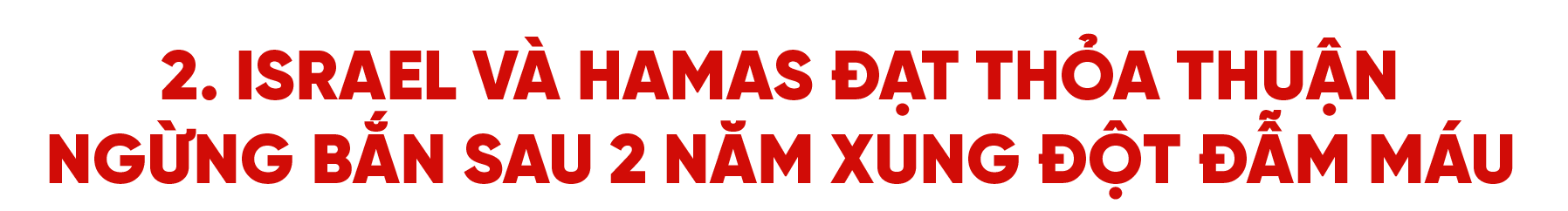 Dưới sự trung gian của Mỹ, Ai Cập và một số nước Arab, ngày 13/10/2025, thỏa thuận ngừng bắn giữa Israel và Phong trào Hamas tại dải Gaza chính thức được ký kết, đánh dấu bước ngoặt quan trọng trong việc chấm dứt hoàn toàn cuộc xung đột bùng phát từ tháng 10/2023 và cướp đi sinh mạng của hơn 70.000 người (tính đến tháng 11/2025). Thỏa thuận ngừng bắn này là giai đoạn 1 của bản kế hoạch hòa bình 20 điểm do Tổng thống Mỹ Donald Trump đề xuất trong đó có đề cập đến việc trao dải Gaza cho chính quyền Palestine và thành lập Nhà nước Palestine nếu các cải cách cần thiết được thực hiện. Tuy còn đối mặt nhiều yếu tố rủi ro nhưng thỏa thuận ngừng bắn tại Gaza được xem là bước tiến chính trị và ngoại giao quan trọng nhất mà các bên đạt được trong nỗ lực chấm dứt bạo lực và thảm họa nhân đạo nghiêm trọng tại dải Gaza.
