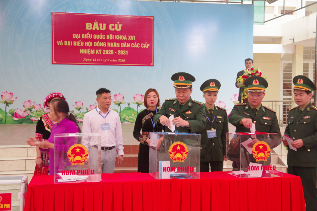 Cán bộ, chiến sĩ Ban Chỉ huy Bộ đội Biên phòng (BĐBP) tỉnh tham gia bỏ phiếu tại khu vực bỏ phiếu số 7, tại Trường THCS Ngọc Xuân, phường Nùng Trí Cao. Thượng tá Tạ Văn Tuân, Chỉ huy trưởng Ban Chỉ huy BĐBP tỉnh; Đại tá Lương Tuấn Long, Chính ủy Ban Chỉ huy BĐBP tỉnh.