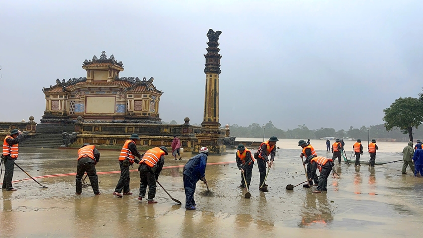 Ngay sau khi nước lũ hạ thấp, Trung đoàn 6 đã huy động 100 cán bộ, chiến sĩ của Lực lượng vũ trang ra quân giúp đỡ, hỗ trợ các địa phương khắc phục hậu quả sau mưa lũ. Với phương châm “Nước rút đến đâu dọn dẹp vệ sinh đến đó”, lực lượng bộ đội thường trực đã có mặt từ sáng sớm trên đường Lê Lợi, trước công viên Trường THPT chuyên Quốc Học Huế để làm vệ sinh môi trường.