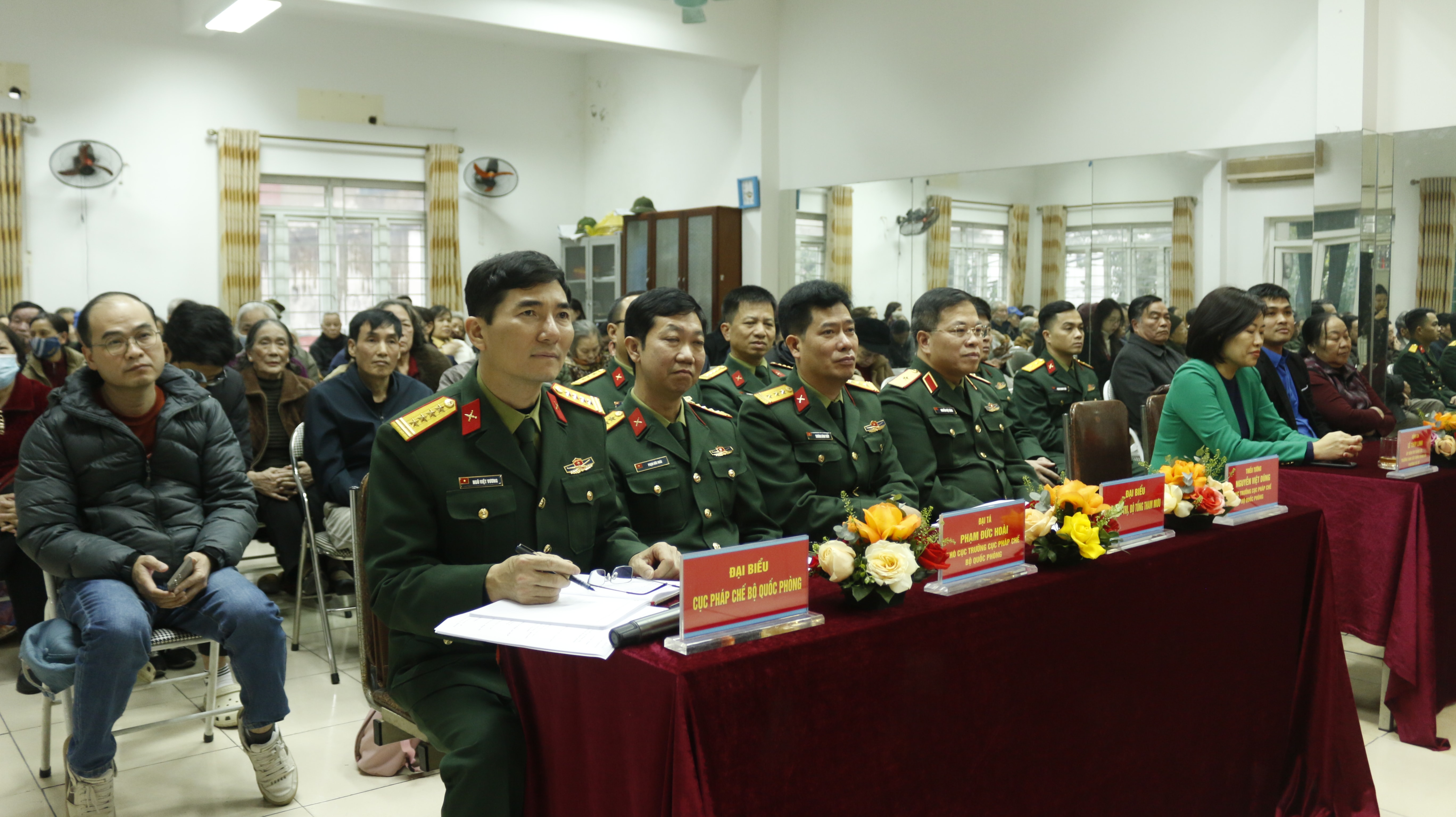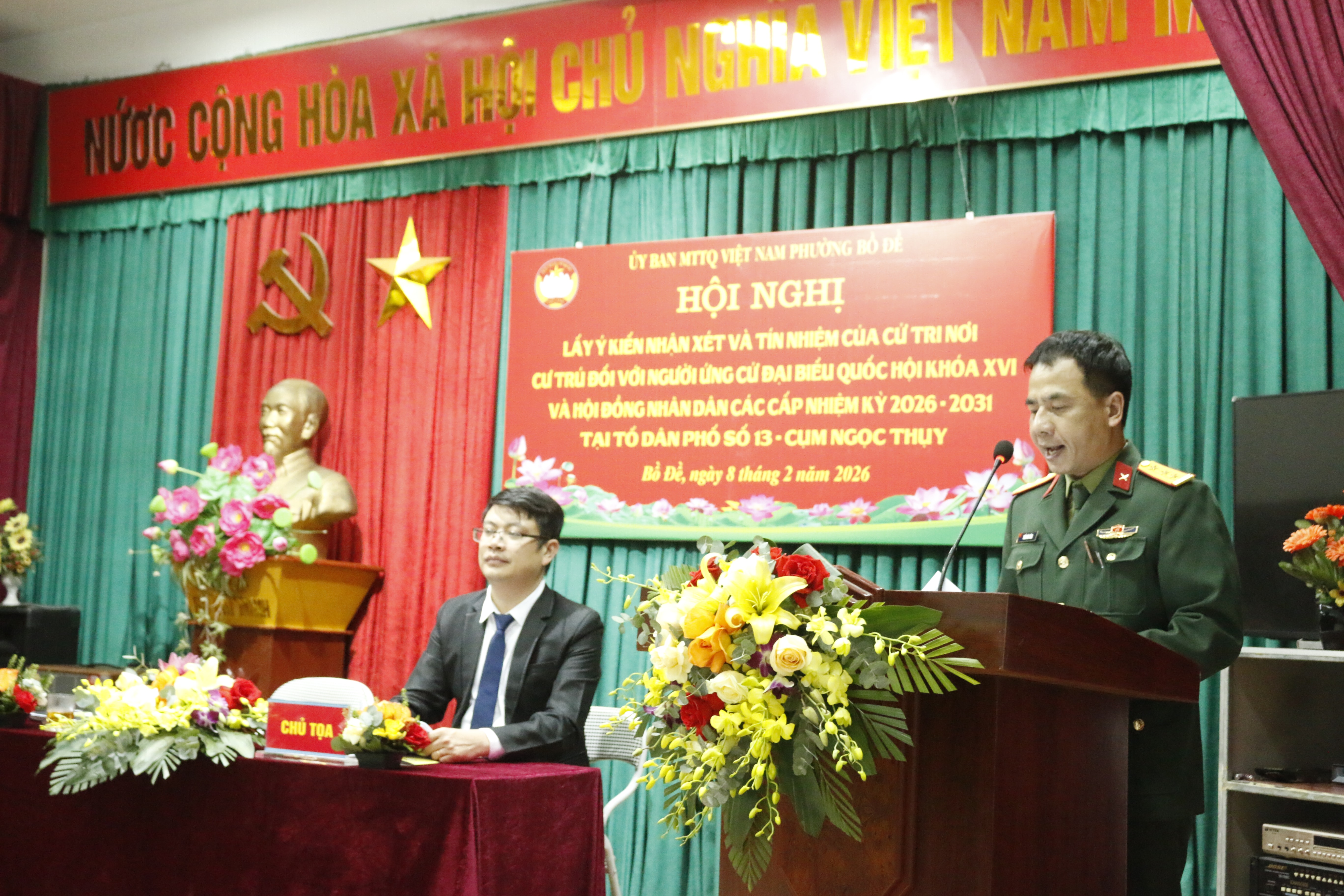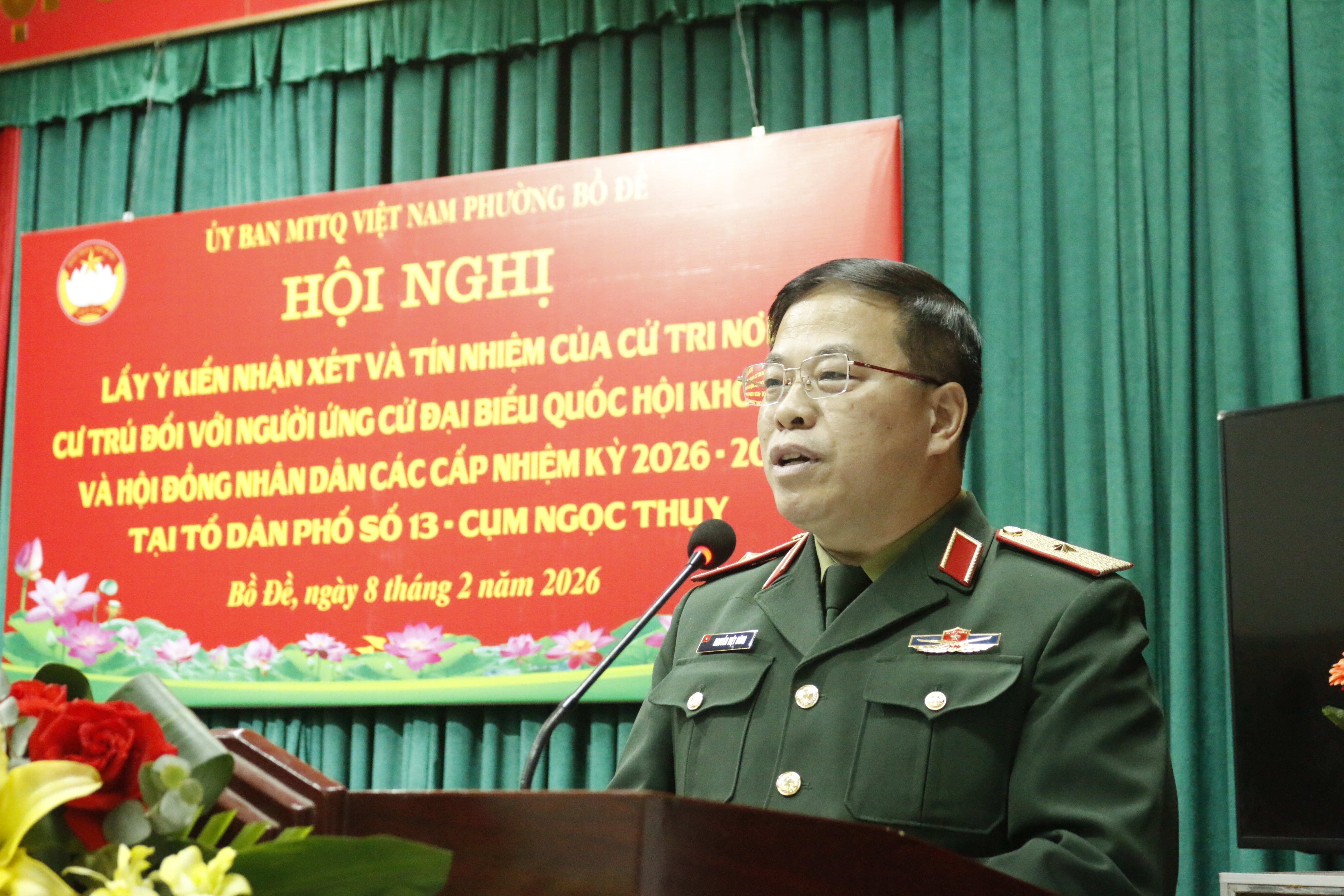 Tham dự hội nghị có Thiếu tướng Nguyễn Việt Dũng, Cục trưởng Cục Pháp chế Bộ Quốc phòng; bà Lê Thùy Linh, Ủy viên Ban Thường vụ Đảng ủy, Trưởng Ban Xây dựng Đảng phường Bồ Đề; ông Trần Văn Tắng, Ủy viên Ban Thường vụ Đảng ủy, Chỉ huy trưởng Ban Chỉ huy Quân sự phường Bồ Đề; cùng hai đại biểu được lấy ý kiến gồm Đại tá Phạm Đức Hoài, Phó Cục trưởng Cục Pháp chế Bộ Quốc phòng; ông Trương Phi Long, Phó Chủ tịch Ủy ban MTTQ phường Long Biên, Bí thư Đoàn Thanh niên phường Long Biên, cùng đại diện cơ quan, đơn vị giới thiệu người ứng cử.