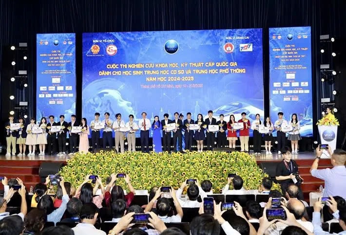 12 thí sinh có dự án xuất sắc được trao giải Nhất tại Cuộc thi Nghiên cứu khoa học kỹ thuật cấp quốc gia dành cho học sinh trung học năm học 2024 - 2025.