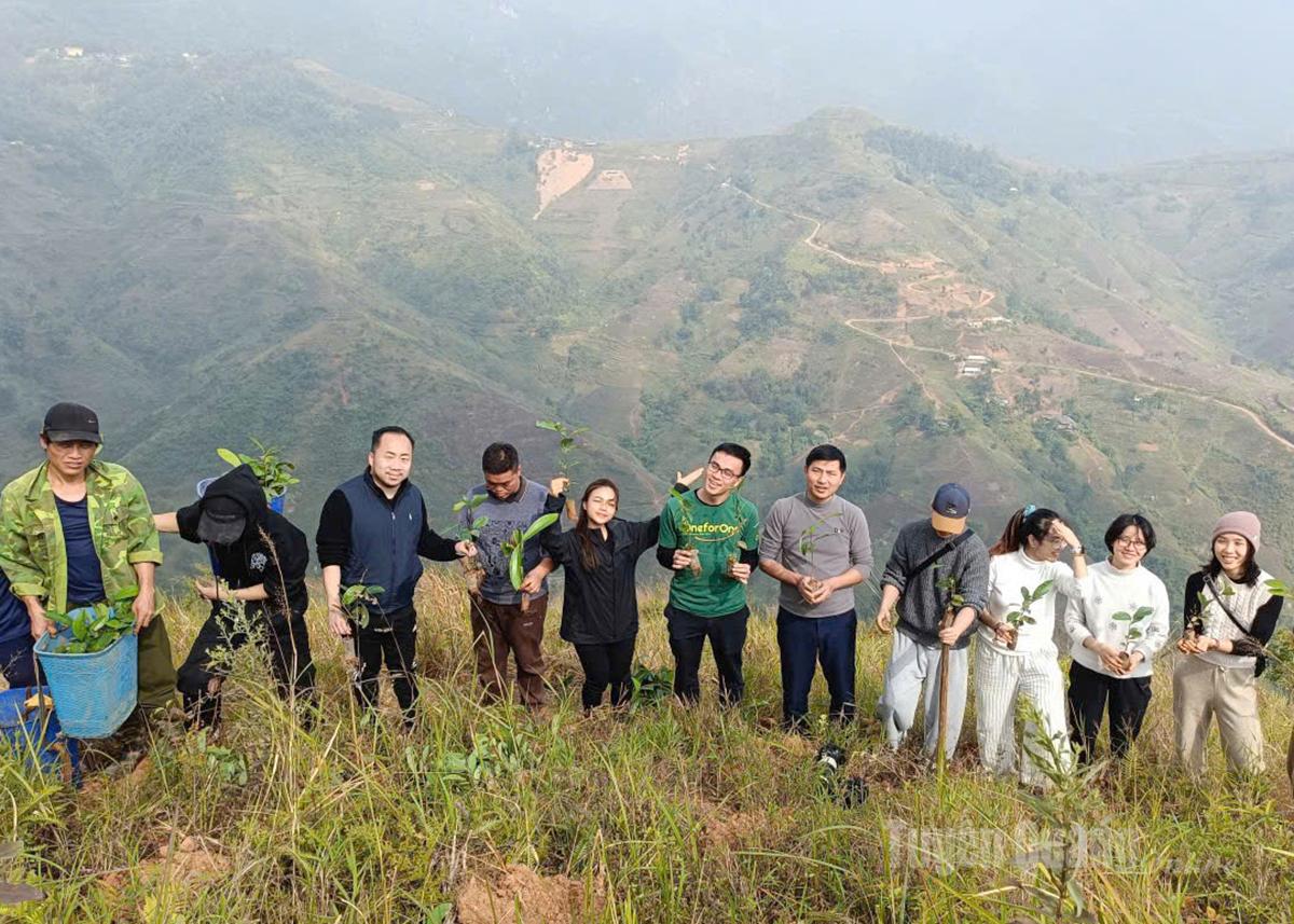 Nhóm thiện nguyện “Những bước chân xanh” cùng người dân thôn Pó Ngần trồng cây quế.
